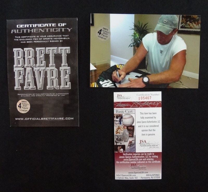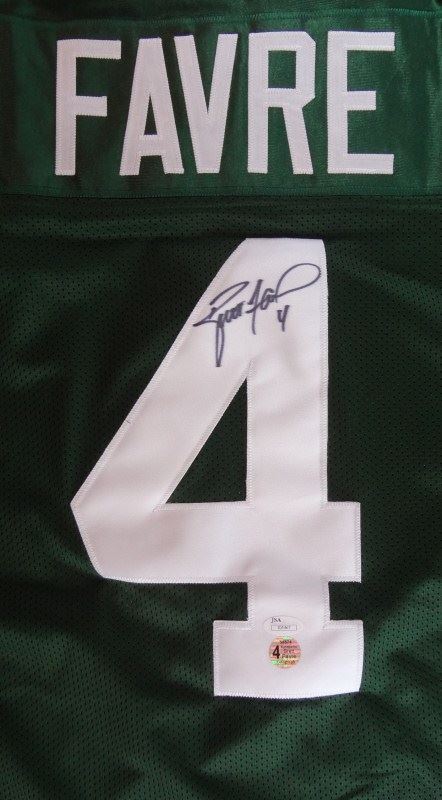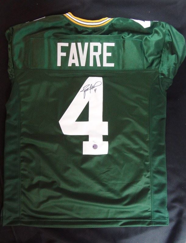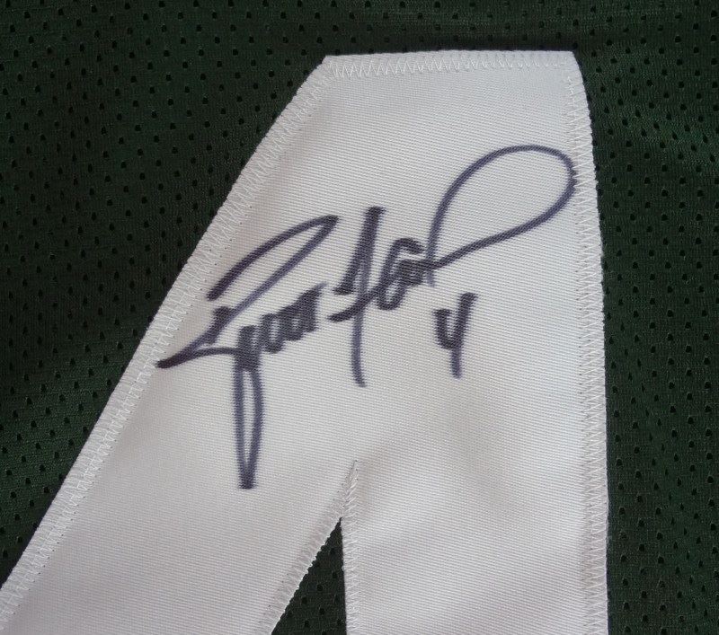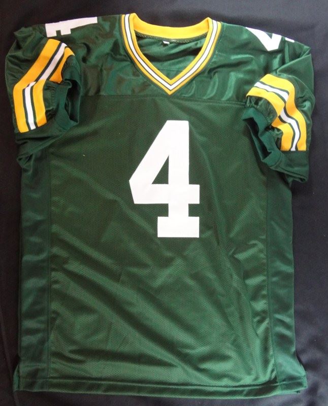 XL NEW CUSTOM GREEN BAY PACKERS JERSEY. SIGNED "BRETT FAVRE 4". EST 300.00-400.00