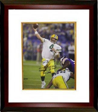 Brett Favre played with the Green Bay Packers from 1992 to 2007. Favre is widely considered to be one of the greatest quarterbacks of all time. He is the only player to win the AP Most Valuable Player three consecutive times (1995–97). He led the Packers to seven division championships (1995, 1996, 1997, 2002, 2003, 2004, and 2007), four NFC Championship Games (1995, 1996, 1997 and 2007), winning two (1996 and 1997), and two Super Bowl appearances, winning one (Super Bowl XXXI). Brett has hand signed this Green Bay Packers Limited Edition of 444- 16x20 Photo with 5 inscriptions including: 508 Tds, 185 Wins, 71,838 yds, 3X MVP & 297 Starts. Photo of the signing, Favre Hologram and Certificate of Authenticity. Custom White Mat and Premium Mahogany Frame as shown.