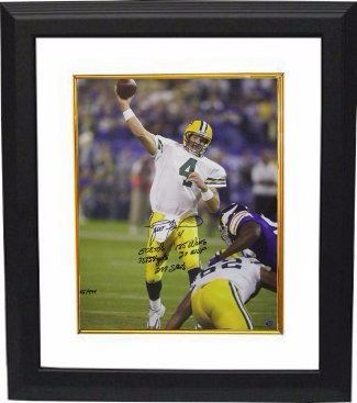 Brett Favre played with the Green Bay Packers from 1992 to 2007. Favre is widely considered to be one of the greatest quarterbacks of all time. He is the only player to win the AP Most Valuable Player three consecutive times (1995–97). He led the Packers to seven division championships (1995, 1996, 1997, 2002, 2003, 2004, and 2007), four NFC Championship Games (1995, 1996, 1997 and 2007), winning two (1996 and 1997), and two Super Bowl appearances, winning one (Super Bowl XXXI). Brett has hand signed this Green Bay Packers Limited Edition of 444- 16x20 Photo with 5 inscriptions including: 508 Tds, 185 Wins, 71,838 yds, 3X MVP & 297 Starts. Photo of the signing, Favre Hologram and Certificate of Authenticity. Custom White Mat and Premium Black Frame as shown.