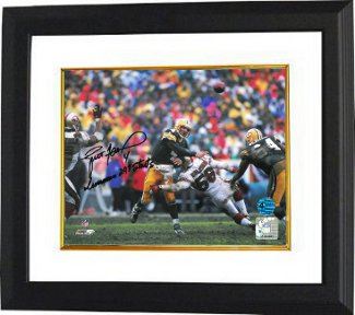 Brett Favre played with the Green Bay Packers from 1992 to 2007. Favre is widely considered to be one of the greatest quarterbacks of all time. He is the only player to win the AP Most Valuable Player three consecutive times (1995–97). He led the Packers to seven division championships (1995, 1996, 1997, 2002, 2003, 2004, and 2007), four NFC Championship Games (1995, 1996, 1997 and 2007), winning two (1996 and 1997), and two Super Bowl appearances, winning one (Super Bowl XXXI). Brett Favre has hand autographed this Green Bay Packers 8X10 Photo with Ironman 297 Starts inscription. Photo of the Signing, Favre Hologram and Certificate of Authenticity. Custom White Mat and Premium Black Frame as shown.