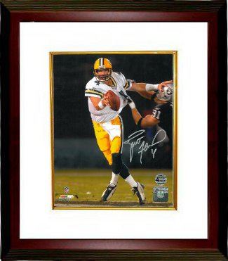 Brett Favre played with the Green Bay Packers from 1992 to 2007. Favre is widely considered to be one of the greatest quarterbacks of all time. He is the only player to win the AP Most Valuable Player three consecutive times (1995–97). He led the Packers to seven division championships (1995, 1996, 1997, 2002, 2003, 2004, and 2007), four NFC Championship Games (1995, 1996, 1997 and 2007), winning two (1996 and 1997), and two Super Bowl appearances, winning one (Super Bowl XXXI). Brett has hand signed this Green Bay Packers 8X10 Scramble Photo. Favre Hologram and Certificate of Authenticity. Custom White Mat and Premium Mahogany Color Framed as shown.