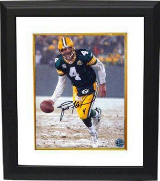 Brett Favre spent the majority of his 20 year career with the Green Bay Packers of the National Football League. Favre is the only quarterback in NFL history to throw for over 70,000 yards, over 6,000 completions, and over 10,000 pass attempts. He made an NFL record 297 consecutive starts. He is the only player to win the AP Most Valuable Player three consecutive times (1995–97), and is one of only six quarterbacks to have won the award as well as the Super Bowl in the same season. He has led teams to eight division championships (1995, 1996, 1997, 2002, 2003, 2004, 2007, 2009), five NFC Championship Games (1995, 1996, 1997, 2007, 2009), and two Super Bowl appearances (Super Bowl XXXI, Super Bowl XXXII), winning one (Super Bowl XXXI). He holds many NFL records, including most career passing yards, most career pass completions, most career pass attempts, most career interceptions thrown, most consecutive starts by a player, most career victories as a starting quarterback, most sacked, and most fumbles. Brett Favre has hand autographed this Green Bay Packers 8x10 Photo in the snow. Favre Hologram, Photo of the Signing and Certificate of Authenticity. Custom White Mat and Premium Black Frame as shown.