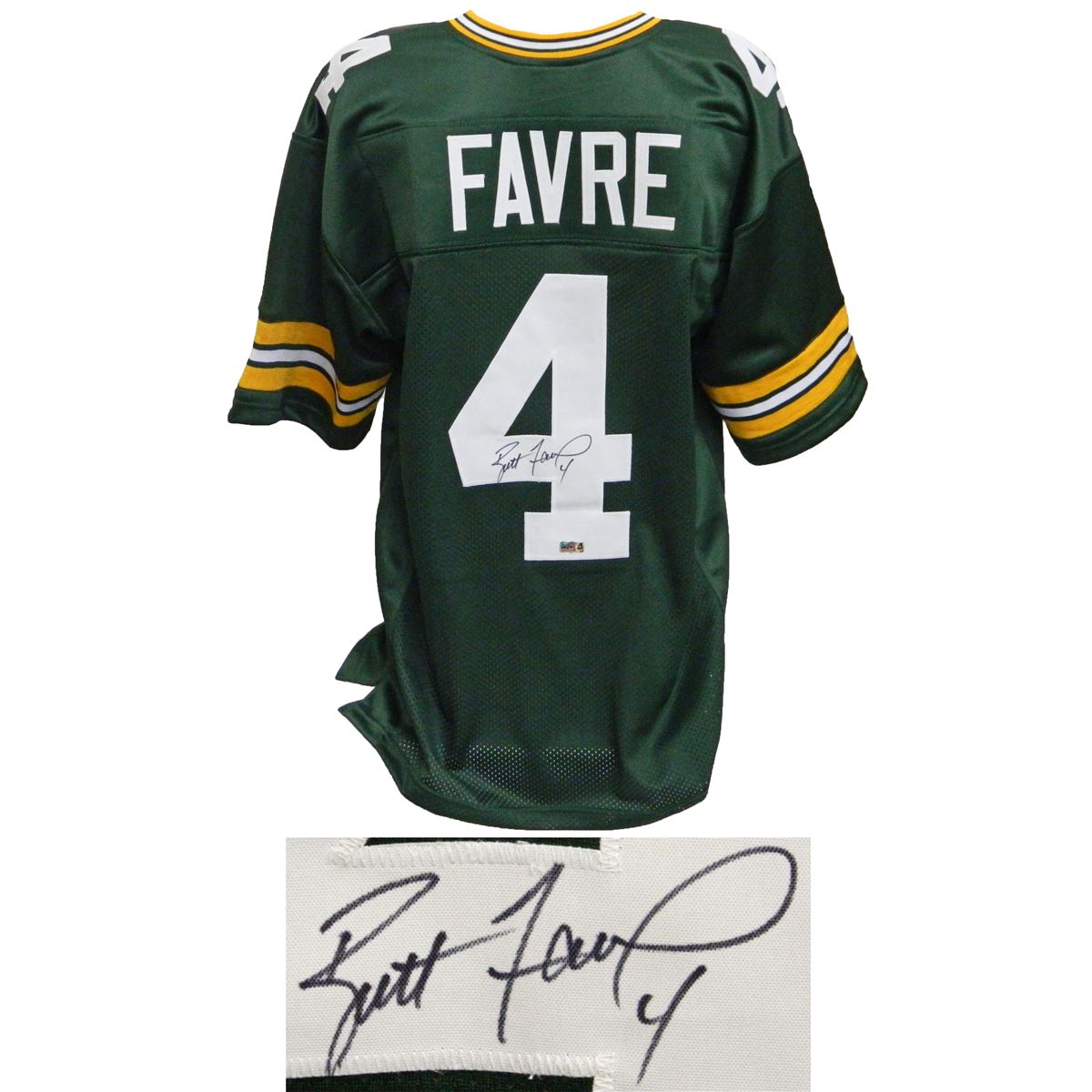 Brett Favre signed green custom football jersey. Item comes with the Brett Favre personal numbered tamper-proof hologram along with a Schwartz Sports Memorabilia tamper-proof numbered hologram and certificate of authenticity which can be verified online.