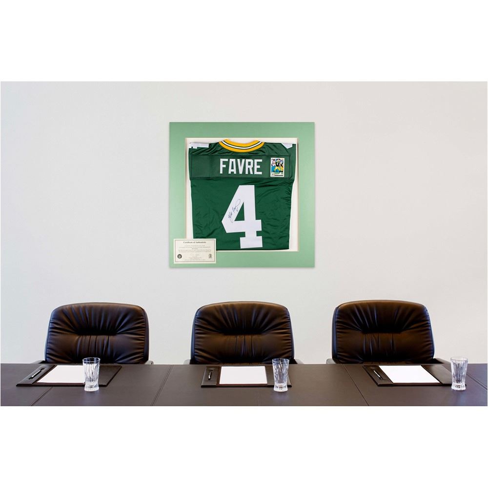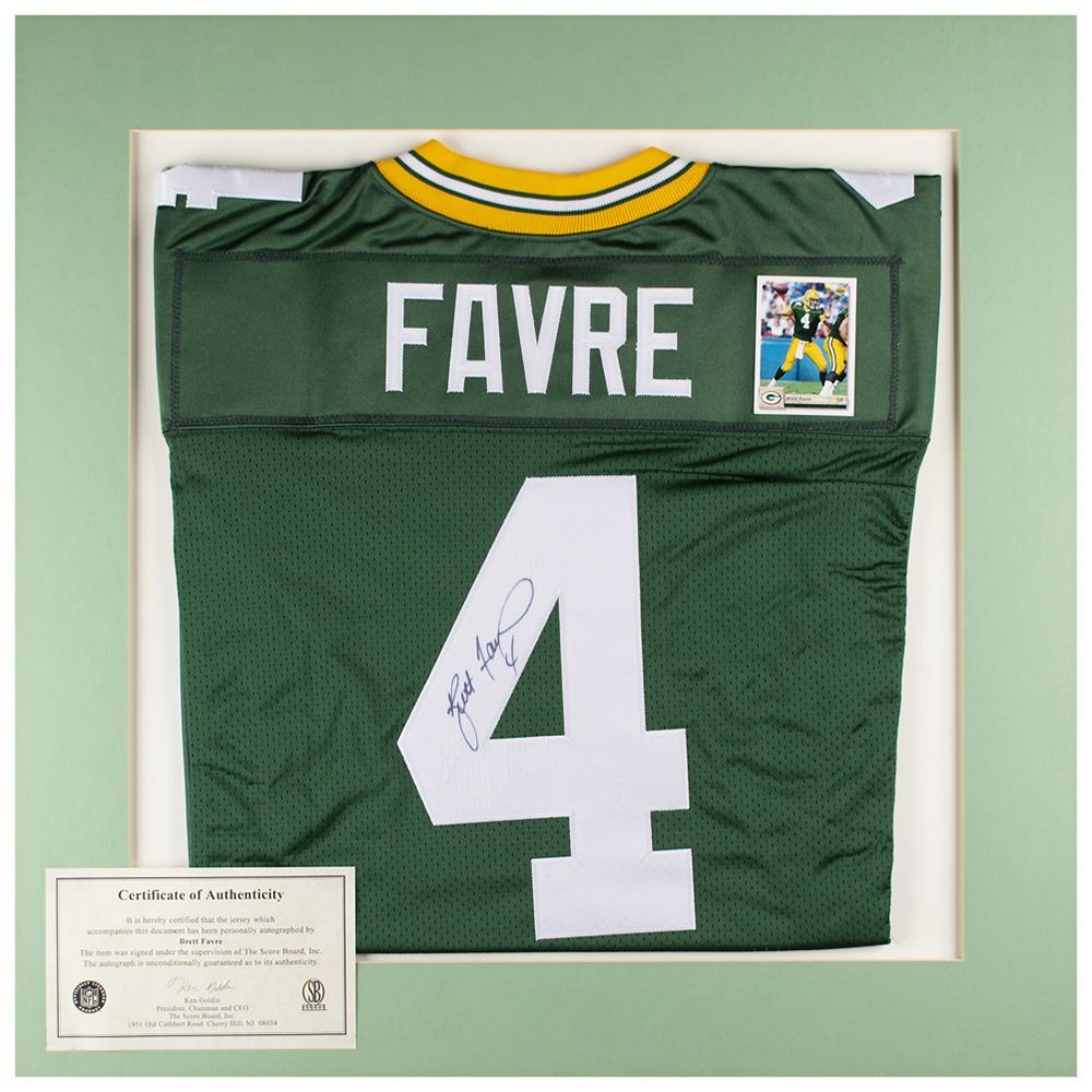 Replica Green Bay Packers football jersey, with sewn on letters and numbers, signed on the number in black felt tip, "Brett Favre, 4." Mounted and matted to an overall size of 27 x 27, with a certificate of authenticity from The Score Board, Inc. affixed to the lower left. In fine condition.