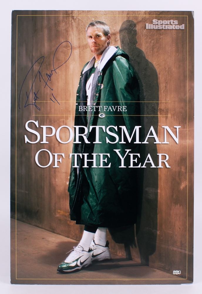 Photo measures 24" x 36" in size and has been hand-signed in blue felt-tip pen by Brett Favre (Packers, Vikings, HOF). Please note: The photo has been adhered to foam board, and shows some slight surface damage and corner creasing. See photos for more details. This item is from Brett Favre's personal collection.