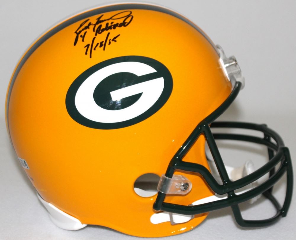 Riddell full-size replica helmet hand-signed and inscribed in black felt-tip pen by Brett Favre. Limited edition hand numbered #13 / 44.Â