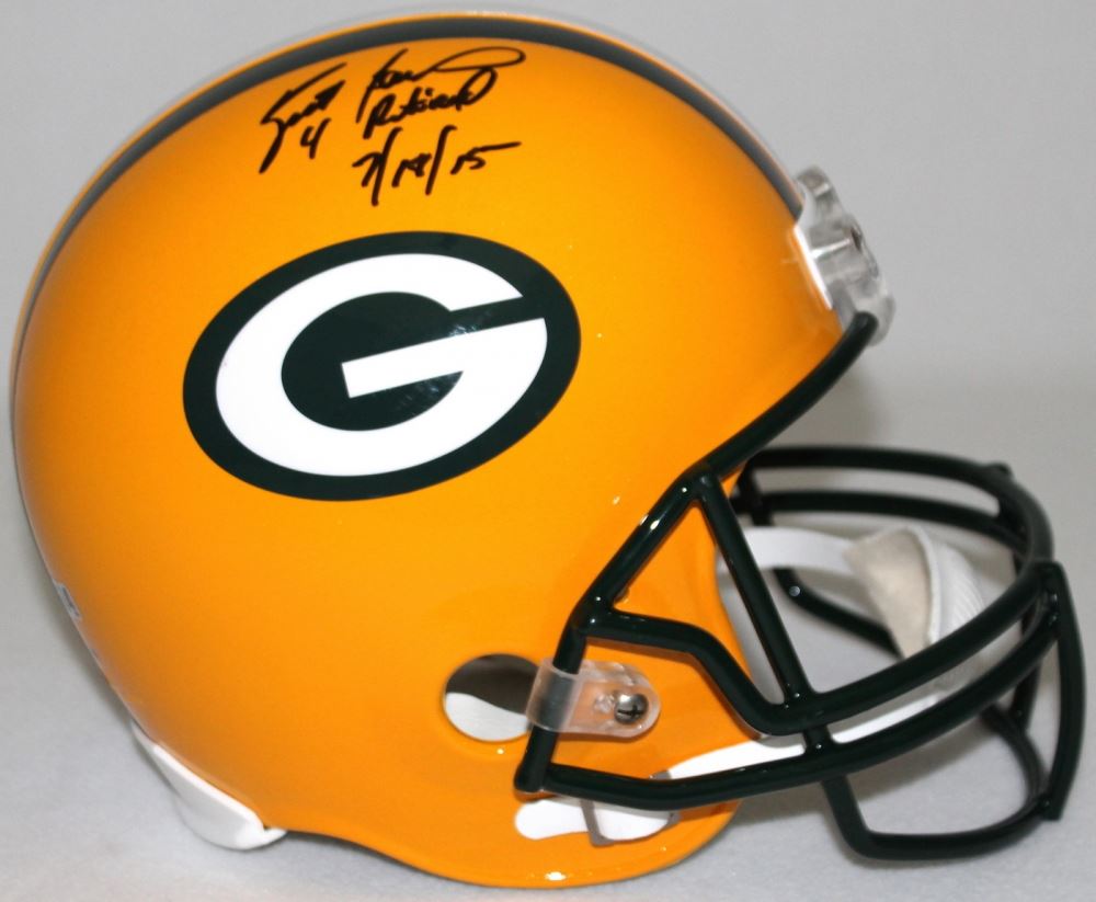 Riddell full-size replica helmet hand-signed and inscribed in black felt-tip pen by Brett Favre. Limited edition hand numbered #8 / 44.Â
