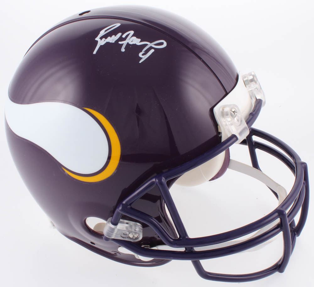 Riddell Minnesota Vikings full-size authentic on-field throwbac khelmet. Hand-signed in white paint pen by Brett Favre (HOF).