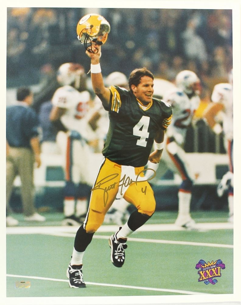 Photo measures 16 " x 20 " in size and has been hand-signed in gold paint pen by Brett Favre. The autograph includes an official Radtke Sports hologram and matching COA for authenticity purposes. Also includes a proof picture from the signing.