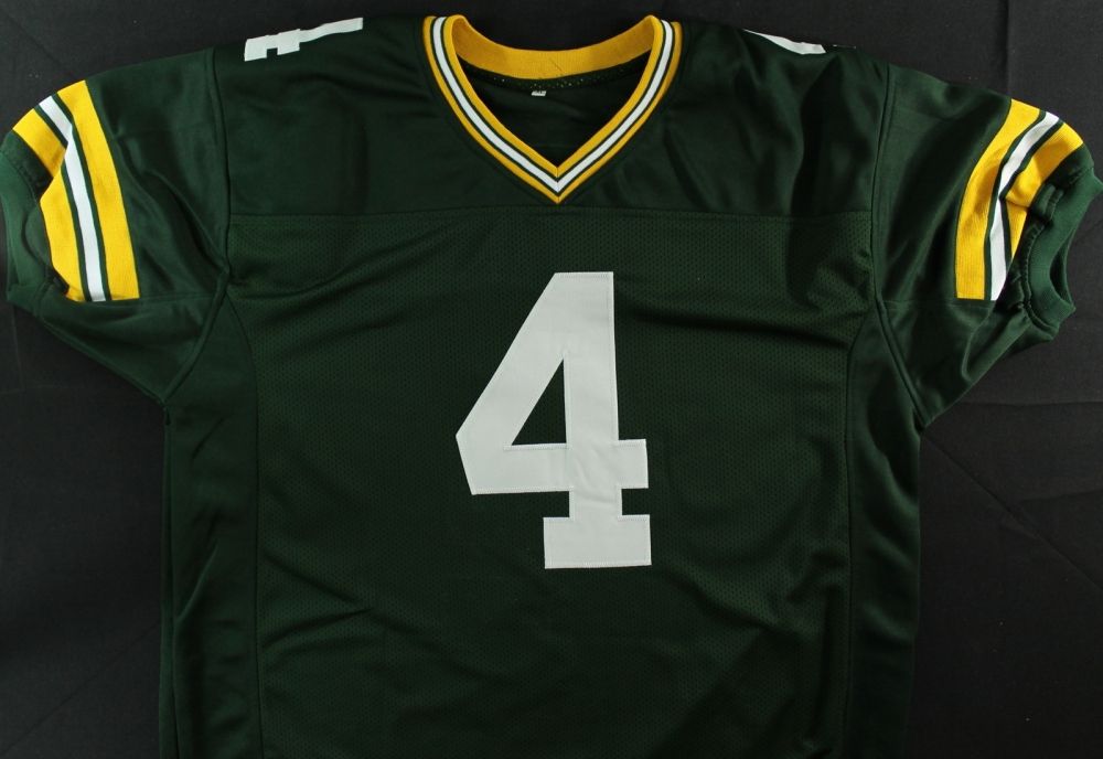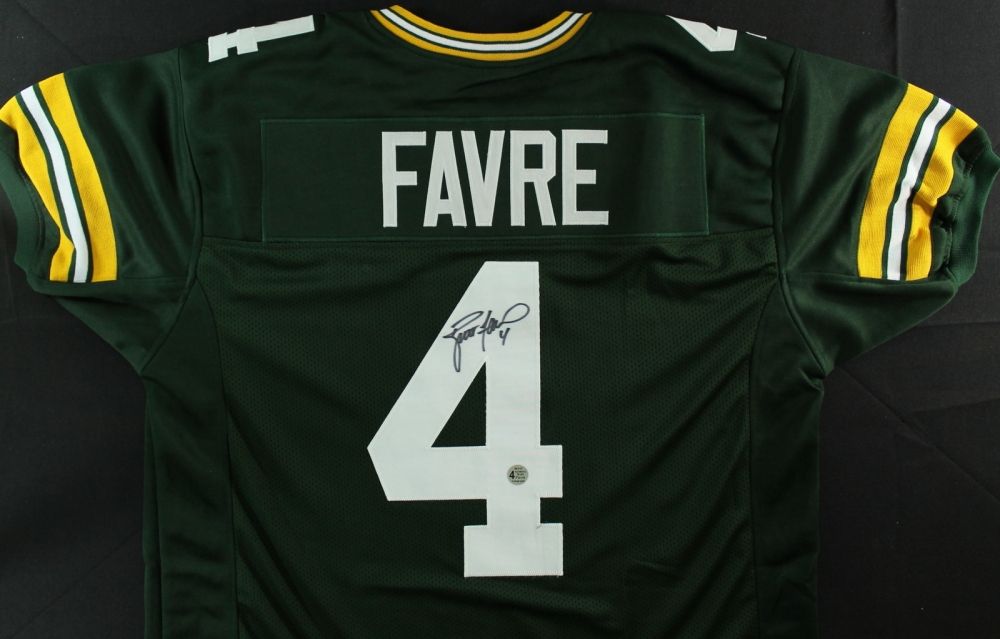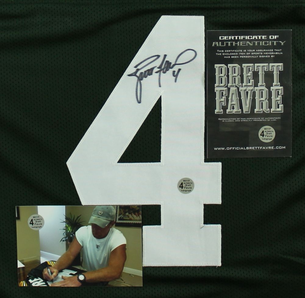 Custom on-field style jersey, size XL. Hand-signed in black felt-tip pen by Brett Favre (Packers). The autograph includes an official Brett Favre hologram and matching COA for authenticity purposes. Also includes a photo of Favre signing.