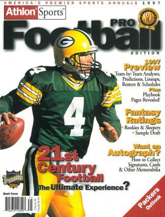 This is an Athlon Sports 1997 Pro Football Magazine with Green Bay Packers Quarterback Brett Favre on the cover. This Preview has team analysis, predictions, lineups, rosters and more for the 1997 Season