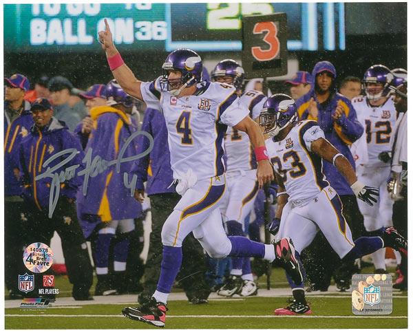 Color glossy 10 x 8 photo of Favre celebrating a touchdown with the Vikings, signed in silver ink. In very fine condition. Accompanied by a photo taken at time of private signing.