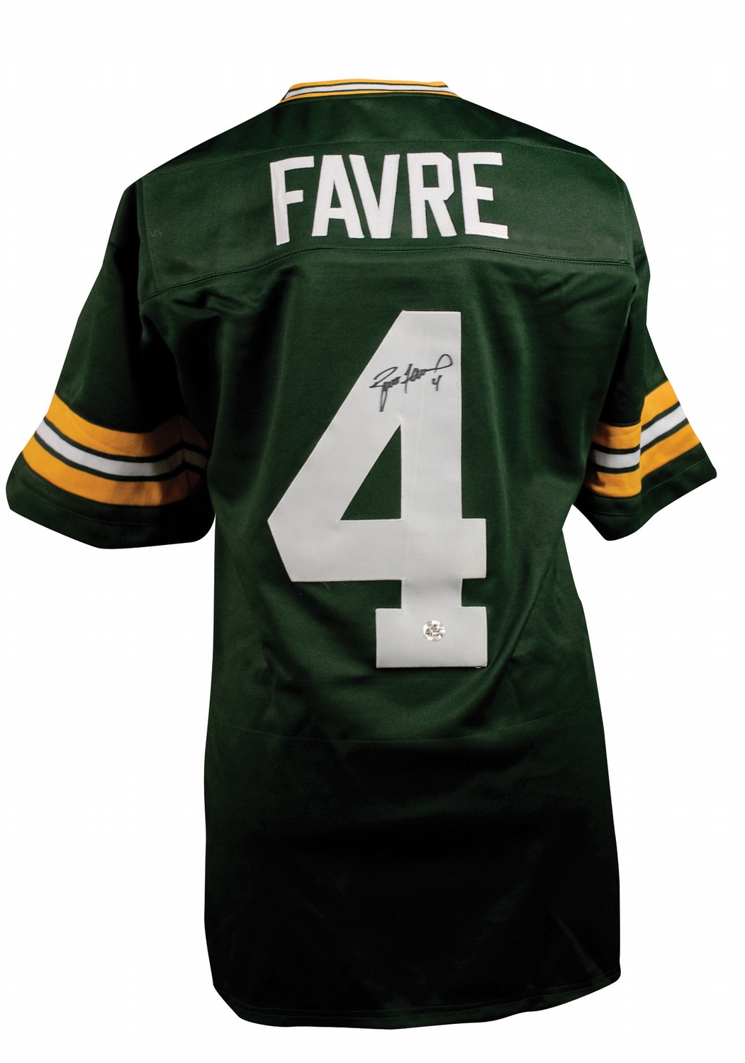 Replica Green Bay Packers football jersey, with sewn on letters and numbers, signed in black felt tip on the number on the back. In fine condition.