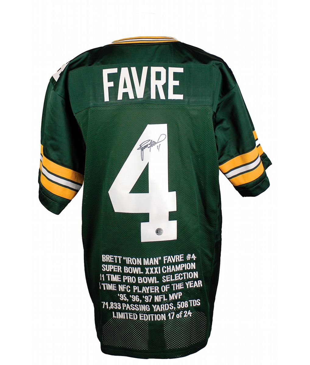 Limited edition replica Green Bay Packers football jersey, with sewn on letters and numbers and embroidered statistics, numbered 17/24, signed in black felt tip on the number on the back. In fine condition, with an official Brett Favre authentication label affixed to number. Accompanied by a certificate of authenticity from Favre’s company and a photo of the signing.