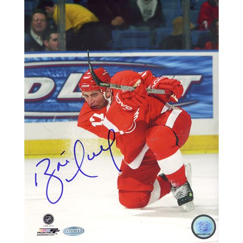 Brett Hull Red Wings Red Jersey Slap Shot Vertical 8x10 Photo