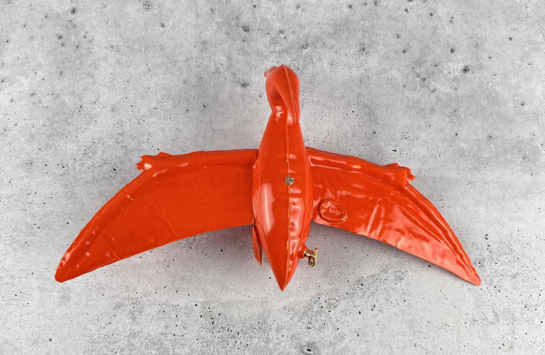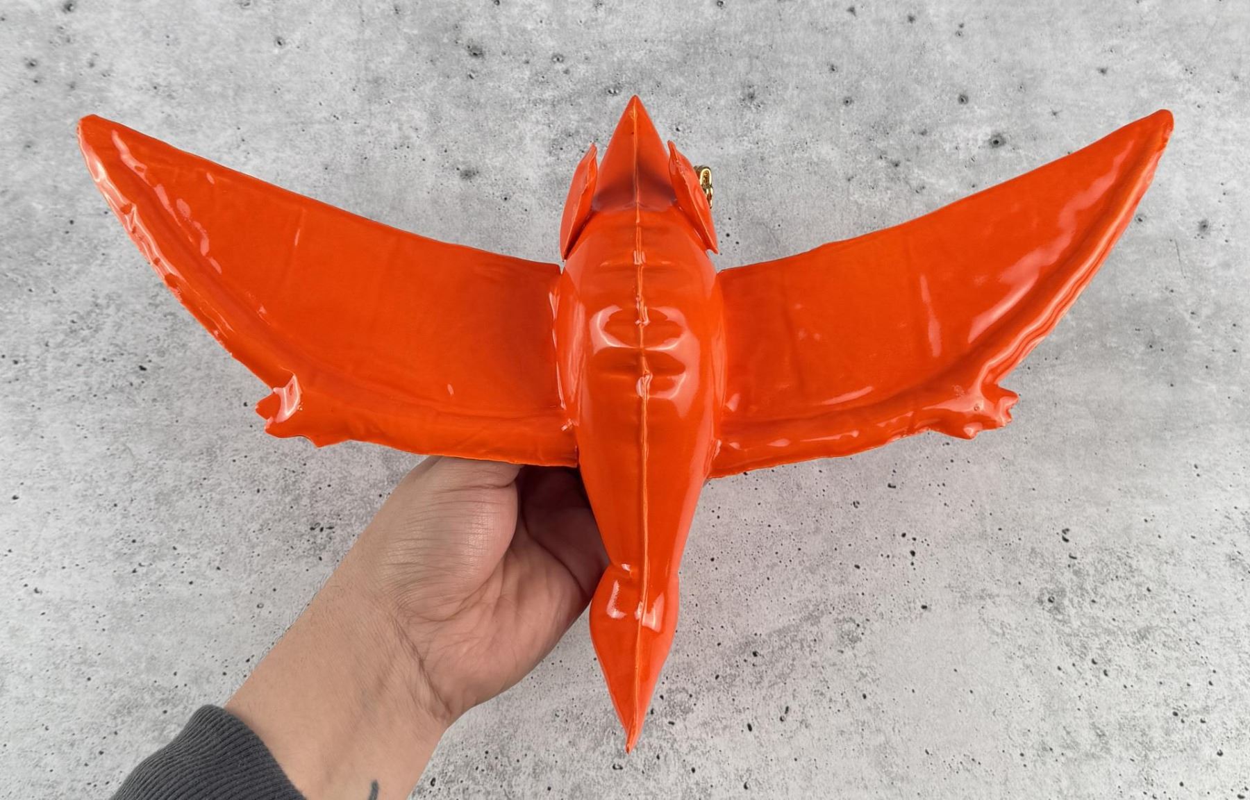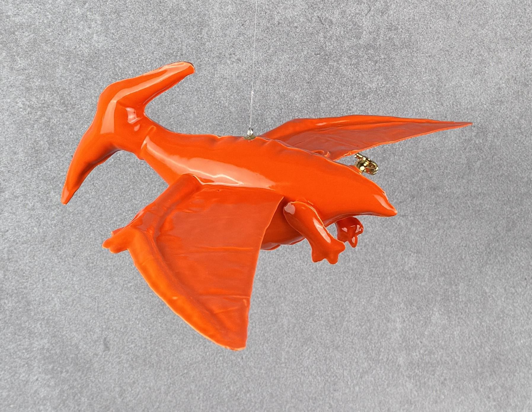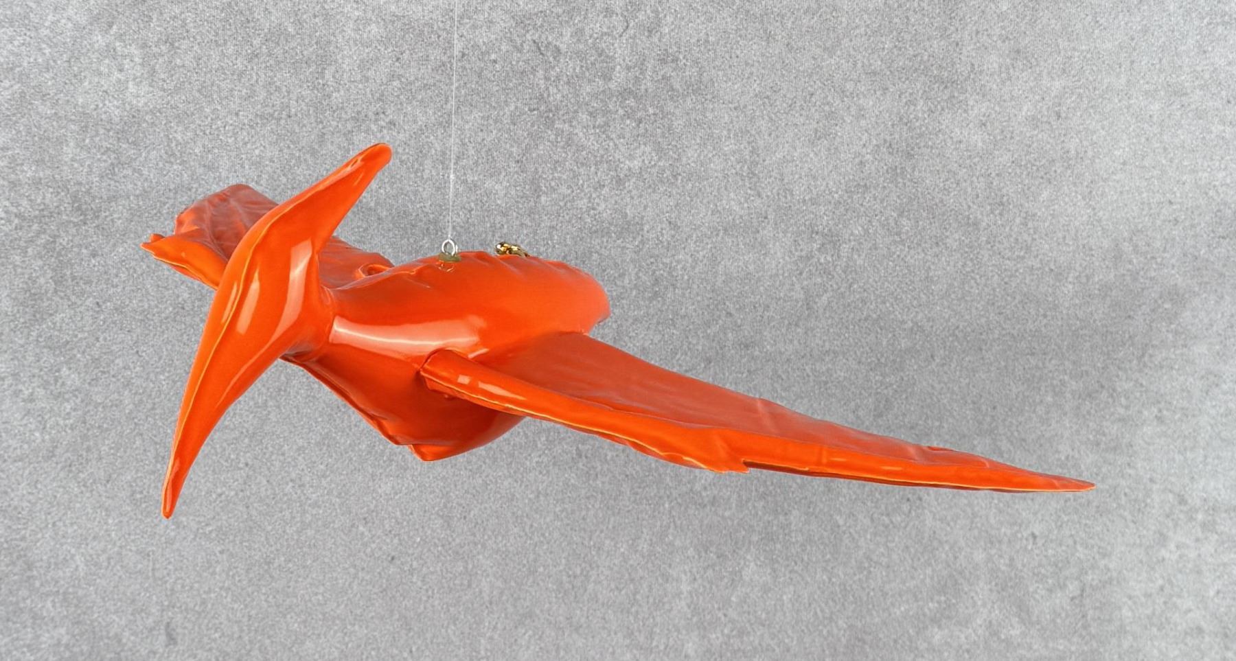 15" by 8 3/4" by 4 3/8". Although it looks inflatable and soft, the pterodactyl is ceramic. Brett Kern (20th Century) is known for Sculpture.