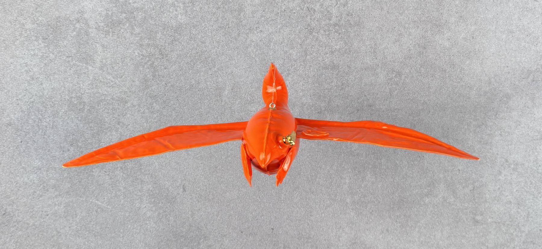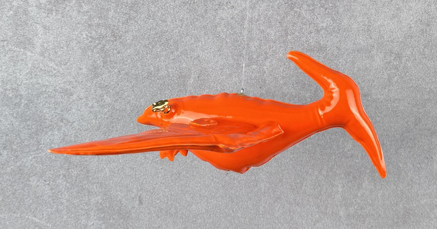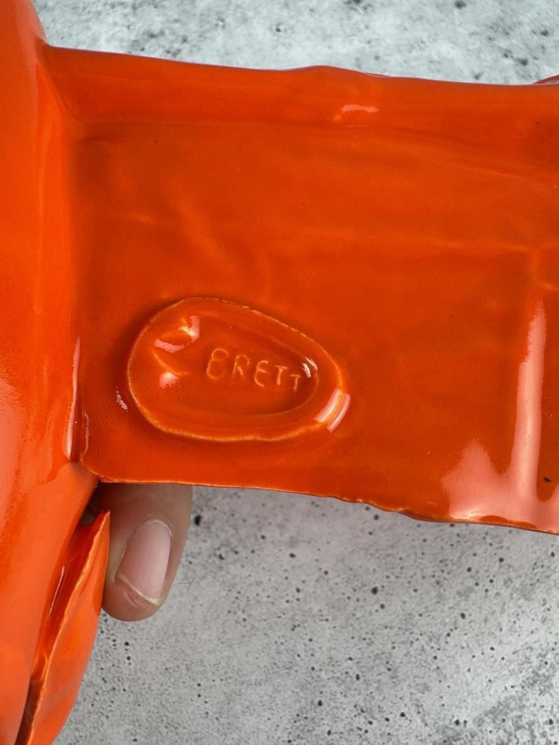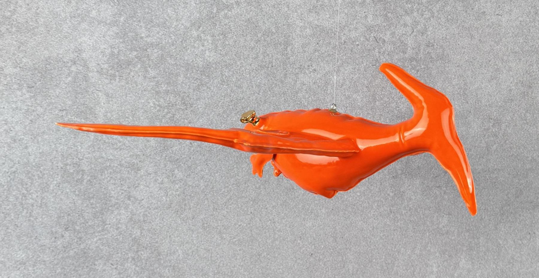15" by 8 3/4" by 4 3/8". Although it looks inflatable and soft, the pterodactyl is ceramic. Brett Kern (20th Century) is known for Sculpture.