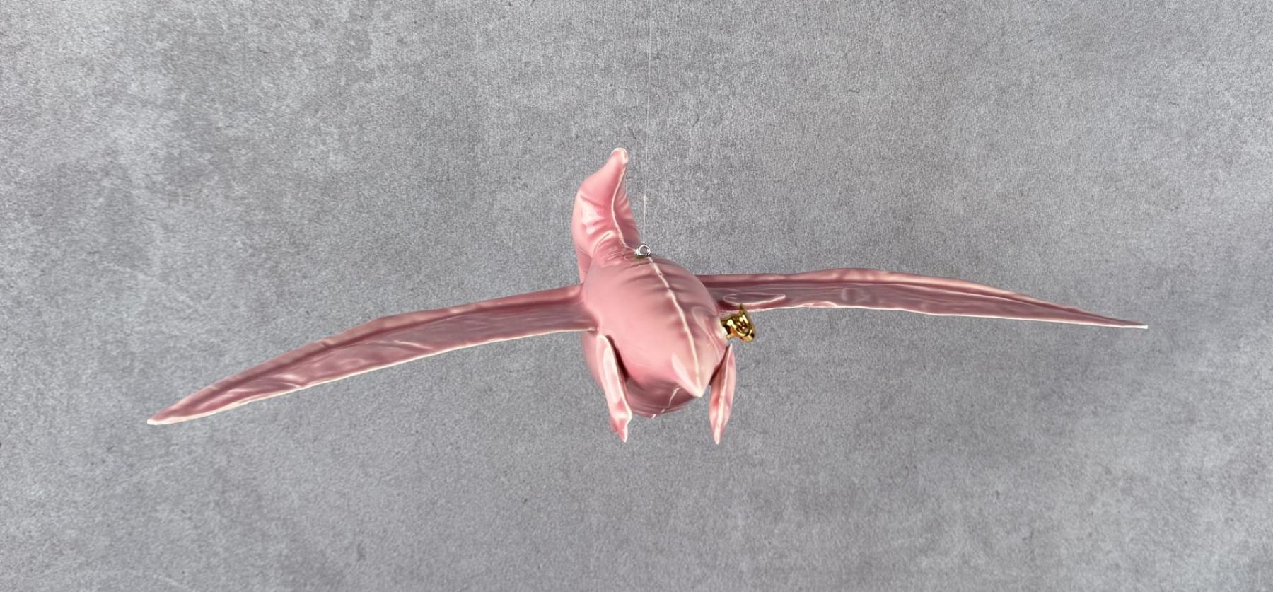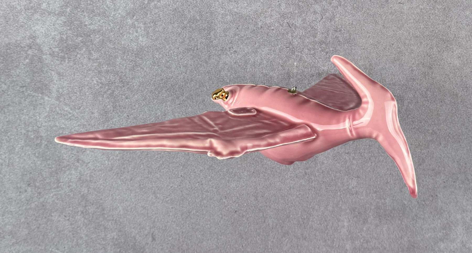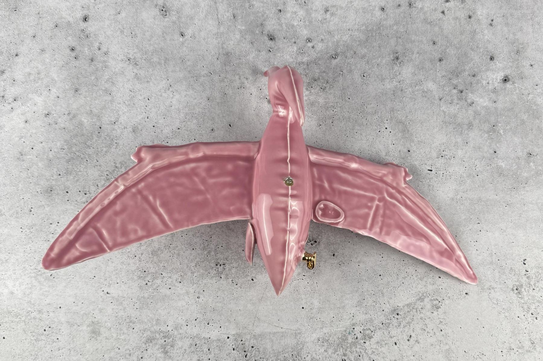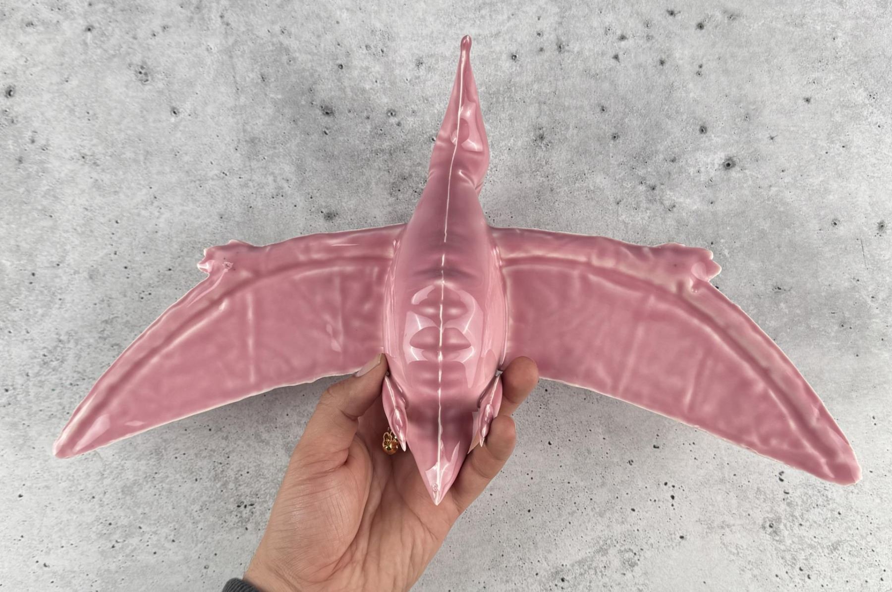15" by 8 3/4" by 4 3/8". Although it looks inflatable and soft, the pterodactyl is ceramic. Brett Kern (20th Century) is known for Sculpture.