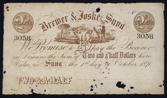 Suva, Fiji, October 1, 1871, 2 & 1/2 Dollars, P-Unlisted, Unissued banknote, brown on cream paper, Native Fijian on shore with sailboat passing and palm trees, S/N 3058, Choice XF to AU but there are 8 or 9 small worm holes and a few ink spots that do not detract from the appearance of this very scarce note. Sold ÒAS ISÓ. Hamel & Fergusen.