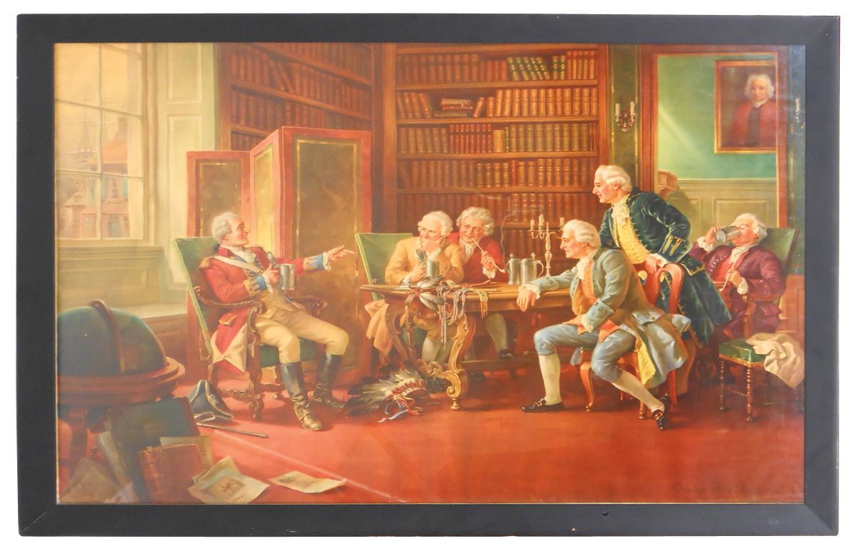 Breweriana, Pabst framed litho, "Courtesy of Pabst Breweries", signed by Geo Hinke, Colonial pub image of soldier admiring Native American artifacts, c.1938, VG+/Exc cond, 33"H x 45"W.