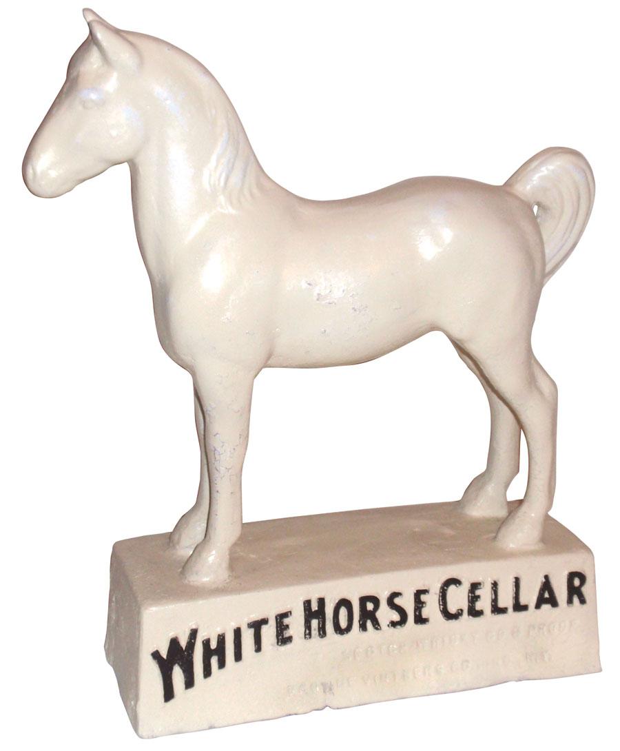 Breweriana, White Horse Cellar Blended Scotch Whiskey store display figure, painted composition w/adv on both front & back, earlier 1900's, Exc cond, 16.5"H x 13"L.