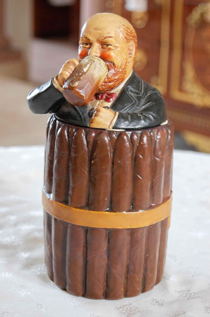 Brewmeister Tobacco Humidor. Depicting gentleman enjoying a beer and pipe while sitting on a barrel of cigars. Stamped "Fadenrohen Cechoslawabie". Minor paint loss to mug otherwise overall very good condition. 8 7/8 inches tall.