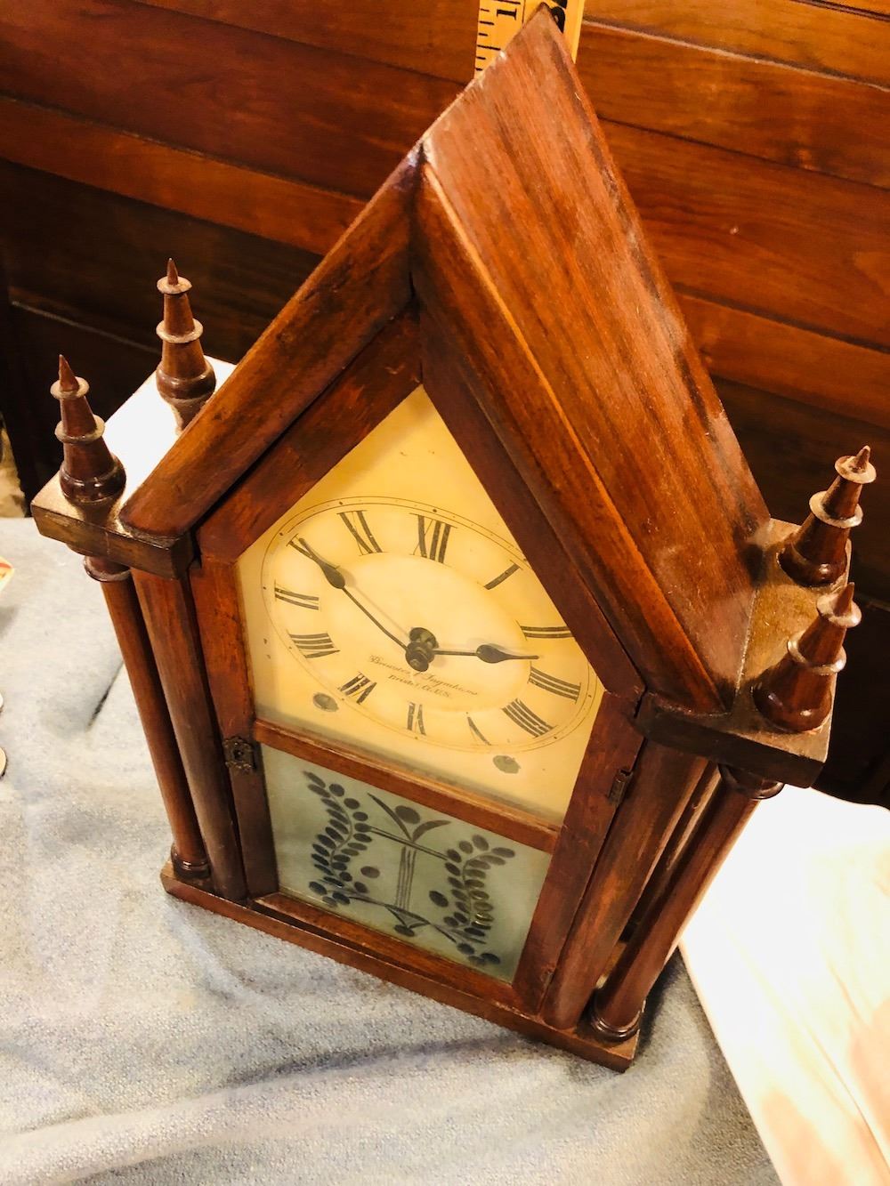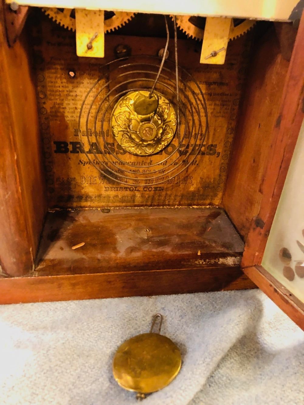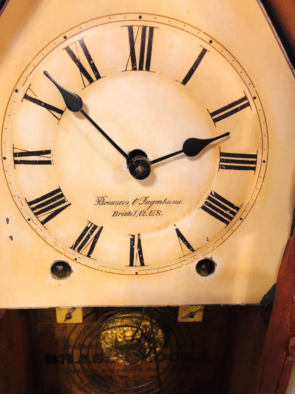 Brewster & Ingrahams Steeple Clock, unbelievable cut etched glass, all original, heavy brass movement, beautiful label and signed dial, Brewster and Ingrahams, Bristol, CT.
