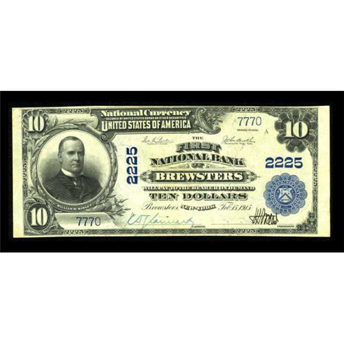 <B>Brewsters, NY</B></I> - $10 1902 Plain Back Fr. 631 <B>The First NB</B></I> Ch. # 2225<BR> This exceptional example comes from Putnam County, this cataloguer's former home and one of the most avidly collected areas of the state. Fewer than a dozen large notes are known, with this new to the census specimen easily the nicest Blue Seal reported to date by a factor of several grades. It's been off the market since our consignor bought it from this cataloguer in February of 1980. <B>Very Fine+++,</B></I> a lovely note which displays two color pen signatures and only minimal traces of circulation. <BR><I>From The Thomas A. Bergin Collection</B></I><BR><BR><b>Shipping:</b> Coins & Currency (<a target="_blank" href="http://www.heritageauctions.com/common/shipping.php">view shipping information</a>)