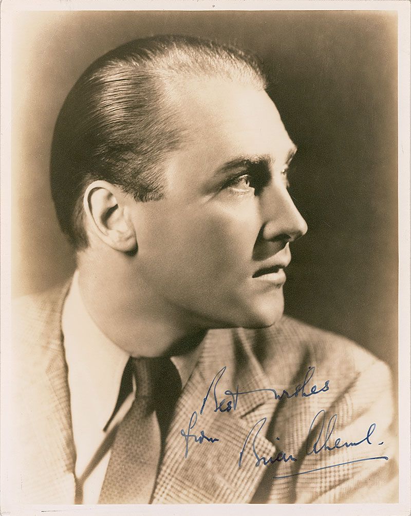 Handsome vintage matte-finish 8 x 10 profile photo, signed in fountain pen, “Best wishes from Brian Aherne.” In fine condition, with a diagonal crease to top left corner and a tack hole to top edge.