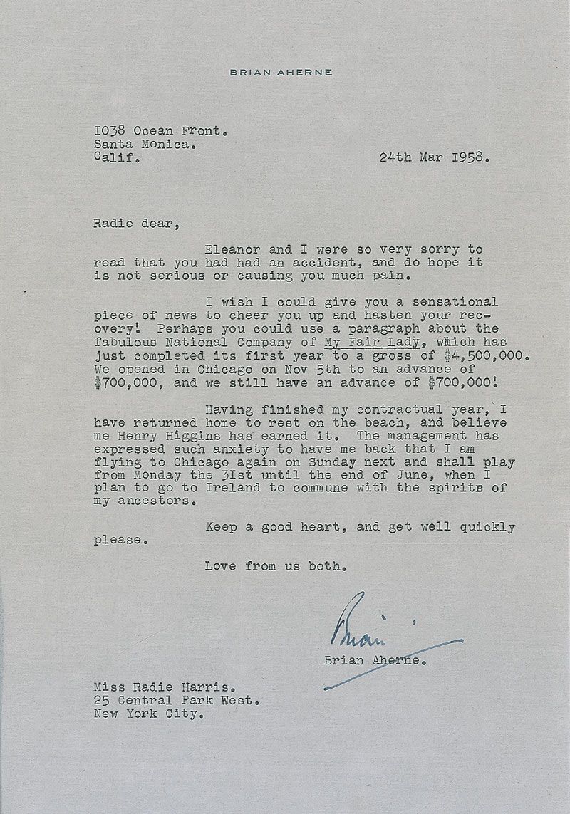 TLS signed “Brian,” one onionskin page, 7.25 x 10.25, personal letterhead, March 24, 1958. Letter to journalist Radie Harris. In part: “I wish I could give you a sensational piece of news to cheer you up and hasten your recovery! Perhaps you could use a paragraph about the fabulous National Company of My Fair Lady, which has just completed its first year to a gross of $4,500,000.” In fine condition.