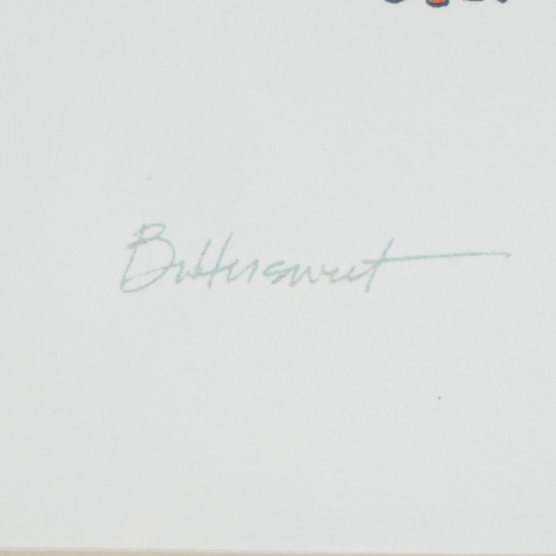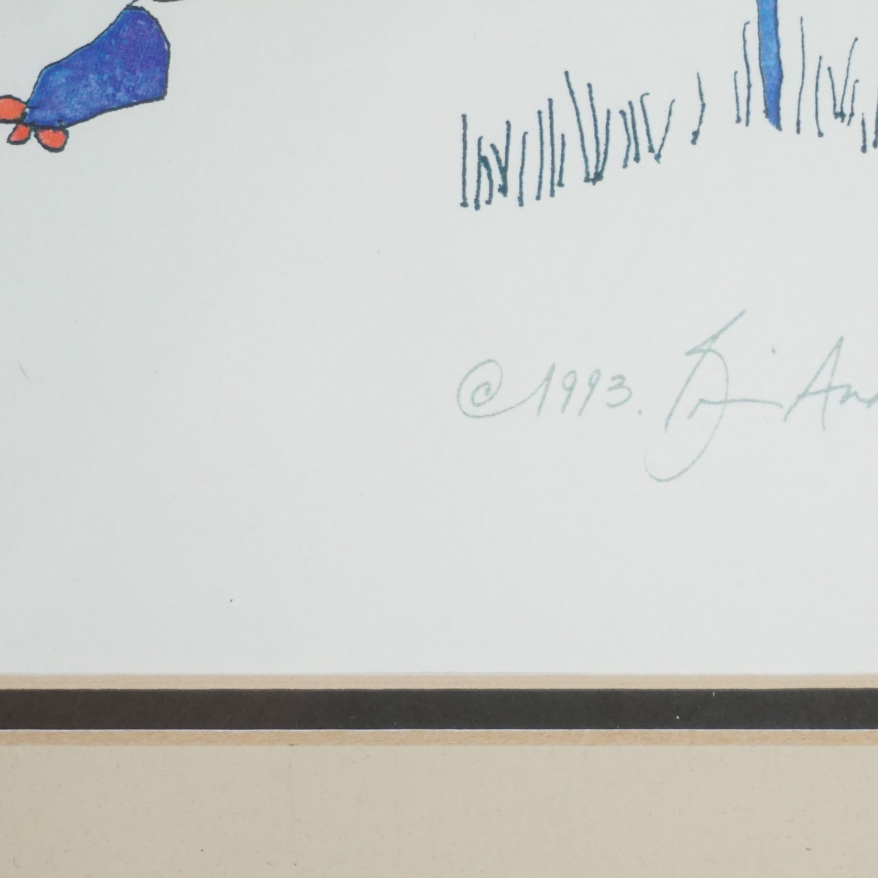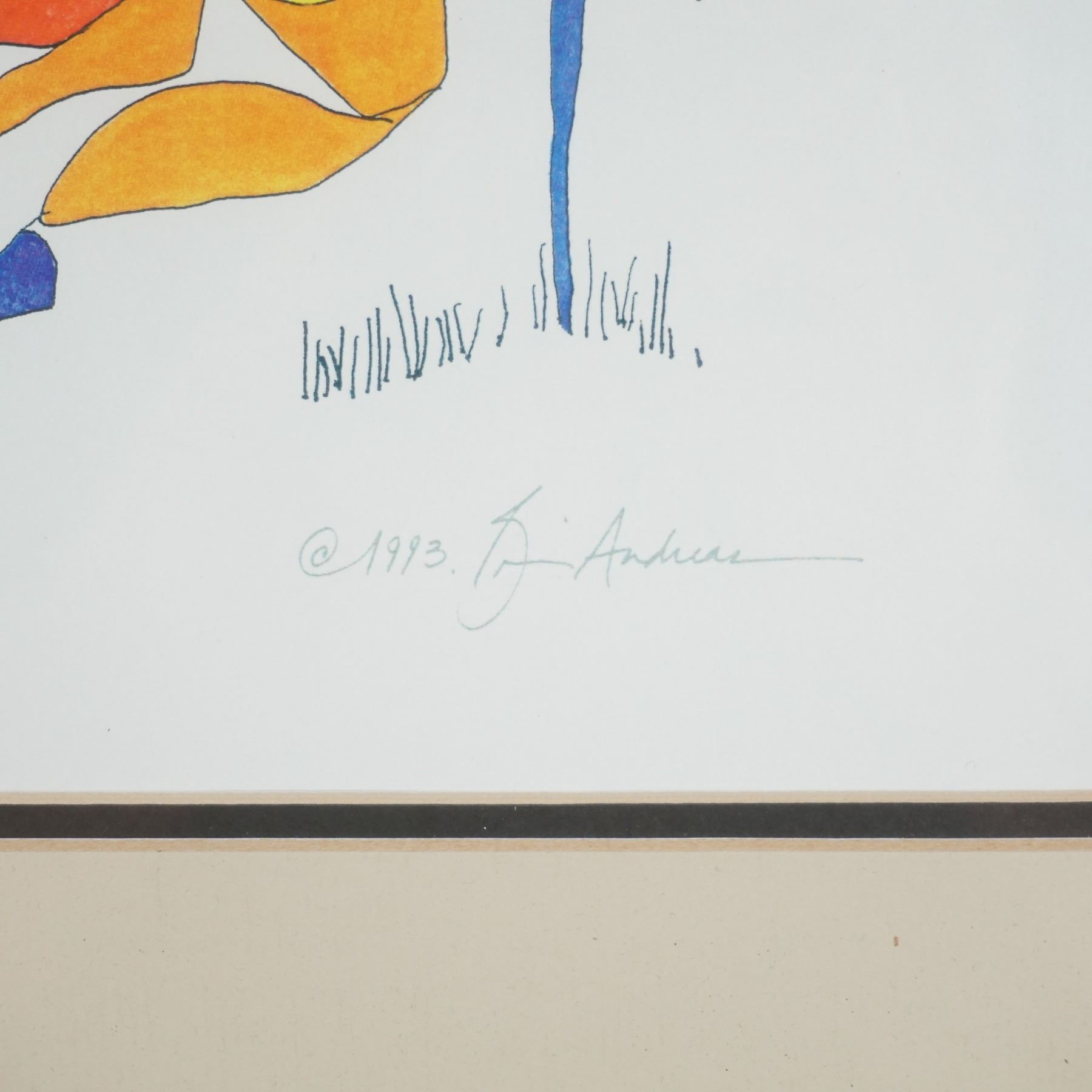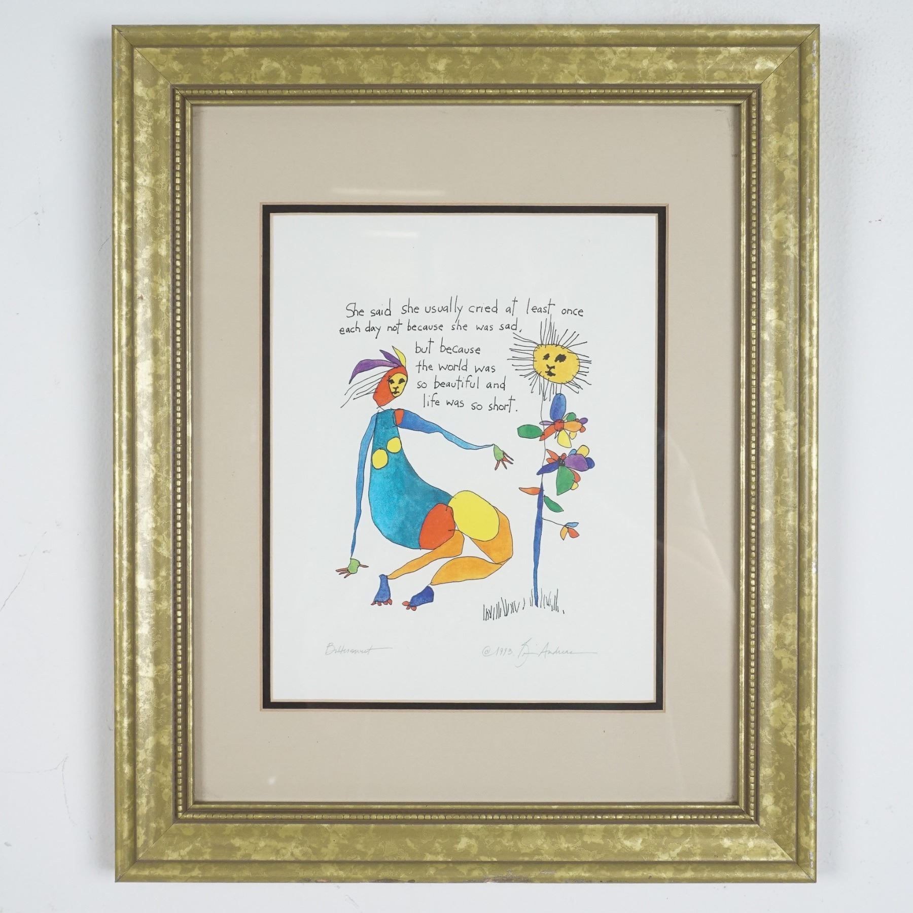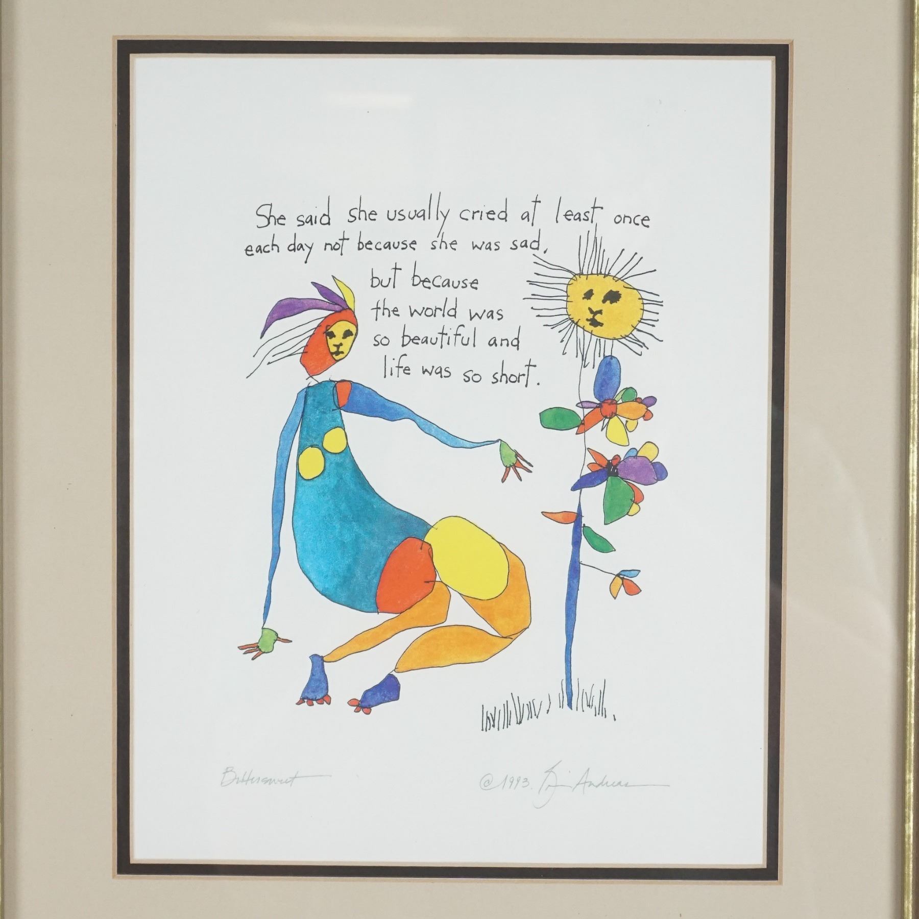 A captivating 1993 artwork by Brian Andreas titled Bittersweet, featuring a colorful, abstract depiction of a whimsical figure in a meditative pose beside a radiant sunflower. The poignant handwritten text reads: She said she usually cried at least once each day not because she was sad, but because the world was so beautiful and life was so short. This piece beautifully combines thought-provoking narrative with vibrant, playful design, making it both visually engaging and emotionally evocative. Signed and dated in the plate by the artist in the lower margin, this artwork reflects B. Andrews' unique artistic style, merging abstract form with introspective poetry. A perfect addition for collectors of contemporary art with a literary twist. Artwork can be unframed and rolled for shipment. Artwork dimensions with frame: 13.50"L x 16.50"H x 1"W.