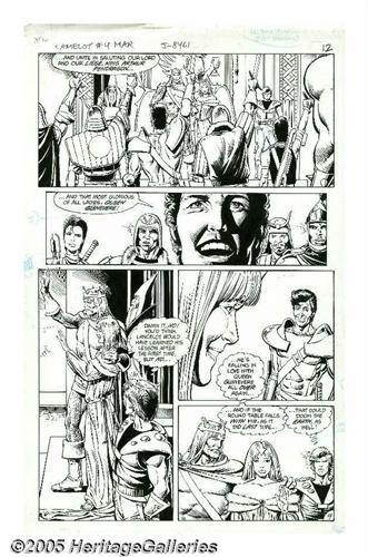 <B>Brian Bolland and Bruce Patterson - Camelot 3000 #4, page 9 Original Art (DC, 1983).</B></I> Although meticulous by nature, Brian Bolland considers himself as much a cartoonist as an illustrator. His knack for making the unbelievable look uncannily real, and the fun that he has doing it, are two of the reasons that his peers count themselves among his biggest fans. DC's <B>Camelot 3000</B></I> was Bolland's first major work for an American publisher, and he came out of the castle running with his sensational work for this series. The Knights of the Round Table unite to salute King Arthur Pendragon on this page from "Assault on New Camelot!" The image area of the page measures 10" x 15" and the art is in Excellent condition.