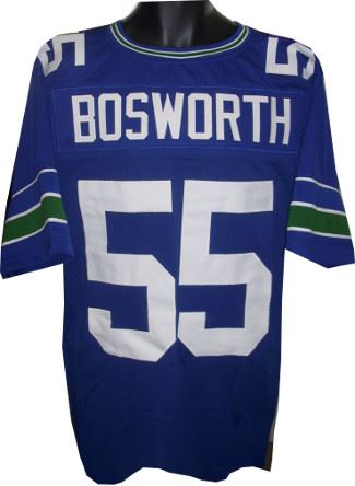 Brian Bosworth was drafted by the Seattle Seahawks in the 1987 NFL supplemental draft and, after initially declaring he would stick to his promise that he would not sign, signed what was both the biggest contract in team history and the biggest rookie contract in NFL history at the time: ten years for US $11 million. Bosworth signed with a Seattle team that had failed to reach the playoffs for two seasons (a 10-6 finish in 1986 was only good enough for 3rd in the old AFC West as they lost out to the Kansas City Chiefs in head to head match-up). He appeared in 12 games in his rookie season, playing well for the most part, but became known more for his outspoken personality and appearance than his actual play on the field. This is a Brian Bosworth Seattle Seahawks unsigned Blue TB unlicensed custom-prostyle jersey with twill stitched nameplate and numbers. perfect for autograph or to wear! Size XL