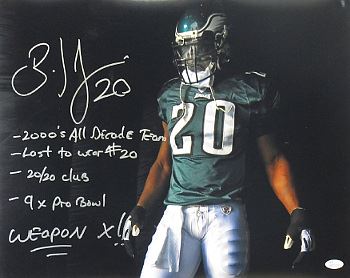 Brian Dawkins is a former football safety who played in the NFL for sixteen seasons. He played college football for Clemson University. He was drafted by the Philadelphia Eagles in the second round of the 1996 NFL Draft, and played thirteen seasons for Philadelphia. Dawkins played his final three seasons for the Denver Broncos. A nine-time Pro Bowl selection, Dawkins is a member of the Philadelphia Eagles 75th Anniversary Team, the NFL 2000s All-Decade Team and the 20/20 Club (20 sacks, 20 interceptions). Dawkins will be eligible for induction to the Pro Football Hall of Fame in 2017. Brian Dawkins has hand signed this Philadelphia Eagles 16x20 Photo with 5 Stats including: 2000's All Decade Team, Last to wear #20, 20/20 Club, 9X Pro Bowl & Weapon X inscriptions. JSA Hologram and Certificate of Authenticity.
