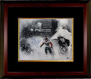 Brian Dawkins is a former football safety who played in the NFL for sixteen seasons. He played college football for Clemson University. He was drafted by the Philadelphia Eagles in the second round of the 1996 NFL Draft, and played thirteen seasons for Philadelphia. Dawkins played his final three seasons for the Denver Broncos. A nine-time Pro Bowl selection, Dawkins is a member of the Philadelphia Eagles 75th Anniversary Team, the NFL 2000s All-Decade Team and the 20/20 Club (20 sacks, 20 interceptions). Dawkins will be eligible for induction to the Pro Football Hall of Fame in 2017. Brian Dawkins has hand signed this Philadelphia Eagles 16x20 Spotlight Photo #20. Certificate of Authenticity from Athlon Sports Collectibles. Custom Black Mat and Premium Mahogany Color Framed as shown.