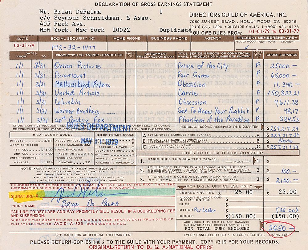 DS, one page, 8.5 x 7, March 31, 1979. Declaration of Gross Earnings Statement submitted to the Director’s Guild of America, listing his earnings from various films, including a whopping $150,833.21 from the classic horror film Carrie. Signed at the conclusion by De Palma. In fine condition, with expected document wear.