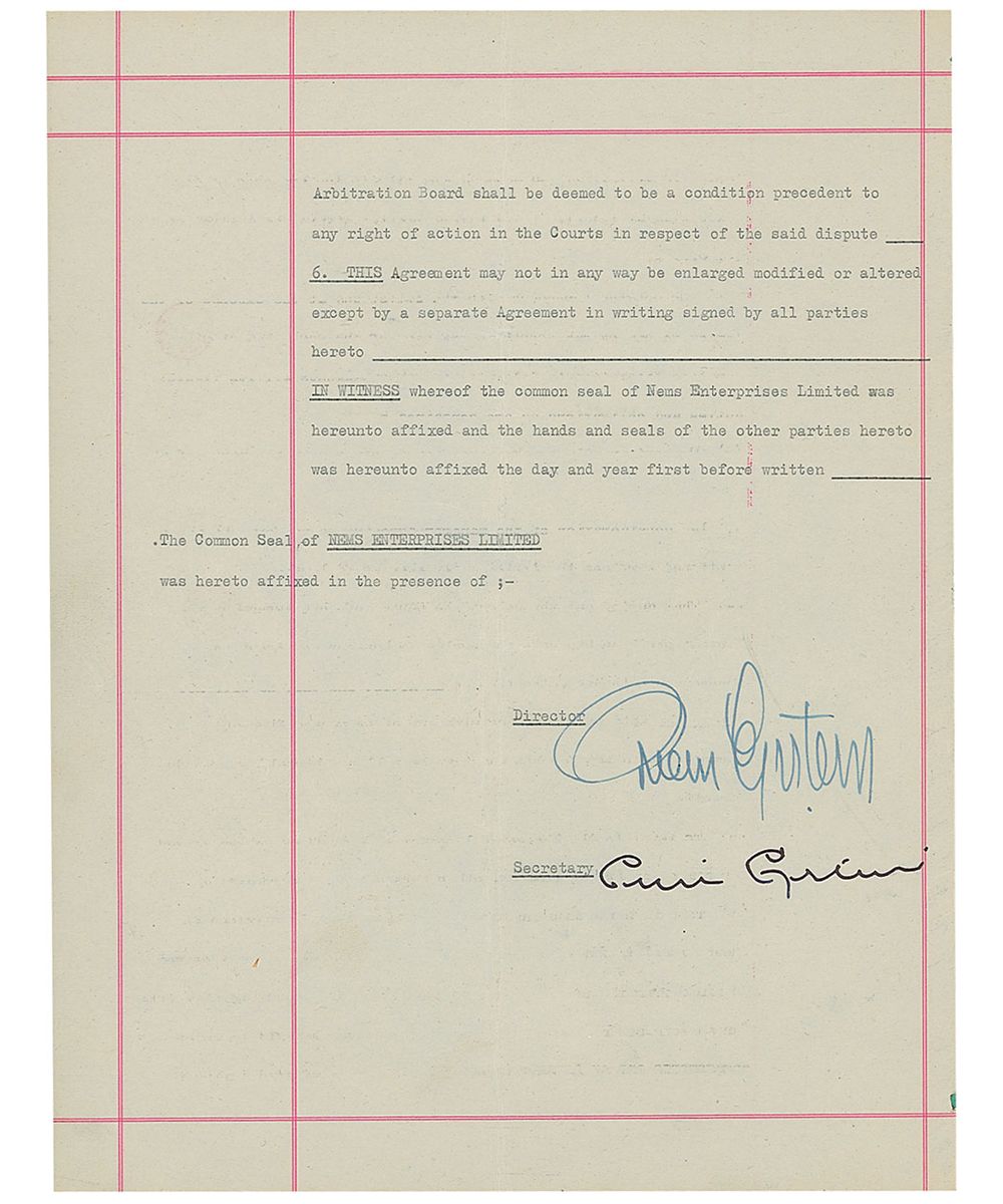 DS, seven pages on two sets of adjoining sheets, 8.5 x 11, February 1, 1963. William Ashton, who is “desirous of performing as a singer to be known as ‘Billy Kramer,’” signs on to be represented by Epstein’s NEMS Enterprises. Signed at the conclusion in fountain pen by Epstein, “Brian Epstein,” in black ink by his brother as secretary, “Clive Epstein,” and in ballpoint by Kramer with his given name, “W. Ashton,” and his father, “O. Ashton.” Document is bound with ribbon into its original paper folder. In fine condition. Kramer, who added ‘J’ as a middle initial at the suggestion of John Lennon, quickly rose to stardom with a number two hit on the UK charts with the release of his cover of the Beatles’s ‘Do You Want to Know a Secret?’ in April 1963. An interesting and historically important document in the the context of the ‘British Invasion.’