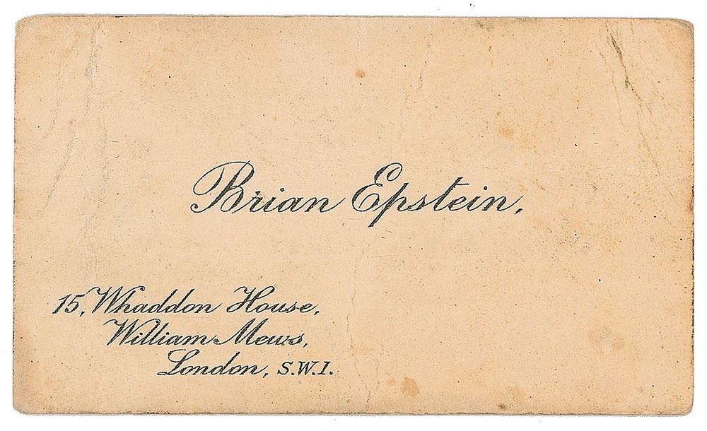 Circa 1960s business card belonging to Beatles manager Brian Epstein, 3 x 1.75, printed with Epstein’s name in cursive text and listing his home address in the lower left: “15 Whaddon House, William Mews, London, S.W. 1.” In very good condition, with soiling and creasing. Consignor notes that the previous owner was given the card by her uncle who was Epstein’s tailor at Huntsman on Savile Row in London. Accompanied by a certificate of authenticity from Tracks.