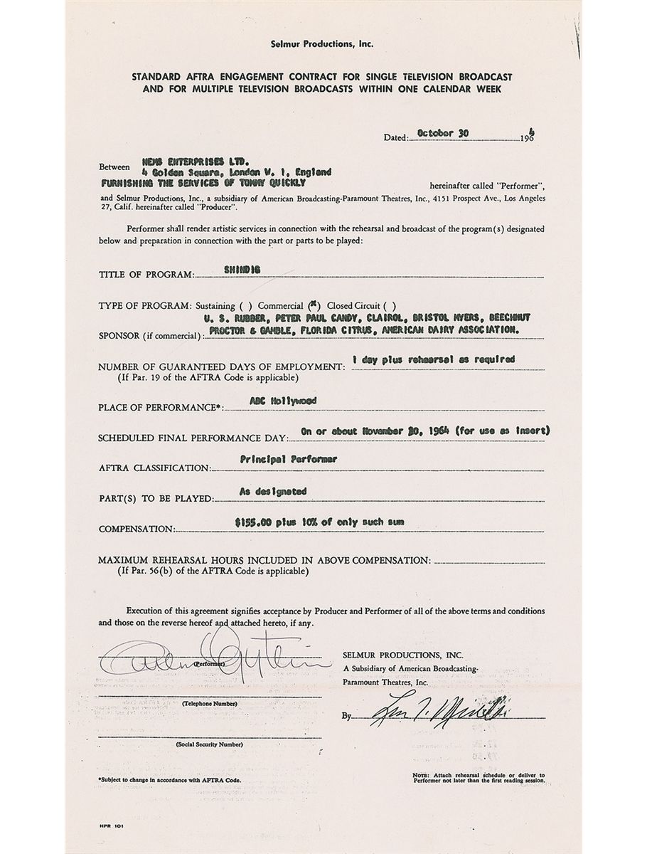 Mimeographed DS signed in black ballpoint, “Brian Epstein,” one page, 8.5 x 14, October 30, 1964. Standard AFTRA contract between Selmur Productions and NEMS Enterprises for a performance by Tommy Quickly on the ABC Hollywood television program ‘Shindig,’ scheduled for November 20, 1964. Signed at the conclusion by Epstein. Scattered overall creases with a heavier one to the top, otherwise fine condition.