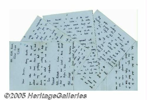 <B>Brian Jones 1963 ALS- The History of the Rolling Stones</B></I> A nine page autographed letter signed on blue paper, 5.5" x 7", dated April 4, 1963 from 102 Edith Grove in London (the flat Mick, Keith and Brian shared) in which group leader (at that time) Brian Jones writes out the entire story of the Rolling Stones. Absolutely amazing content with brief biographical sketches of the members, a history of how they were formed, their current performances, recordings, and their plans for the future. It is written to Doreen Pettifer (original mailing envelope included) and starts out: "Dear Doreen, Many thanks for your letter and for the great interest you have shown in the band. It is very gratifying that you should be so willing to help us to the extent you are doing so. Some information:-..." Brian then lists the personnel with a brief biographical sketch of each. At this point in Rolling Stones history, Bill Wyman and Charlie Watts had joined the band, and Ian Stewart was still a member. Jones continues: "Formation & History. The band is really an amalgamation of two bands. The one being one I formed about a year ago, & the other being a group run by Mick & Keith in S.E. London. I was introduced to Keith & we decided to pool our resources, so with Stu from my band, and Mick from Keith's we became the nucleus of the 'Stones"." Brian continues with a history of their early gigs and personnel additions and brags that "We have, I may add, a habit of breaking attendance records." Regarding their recordings: "We have signed an agreement with an independent recording company, I.B.C., who channel their releases through the major company labels. We have already cut quite a few sides, all on the commercial side. We ourselves do not know how negotiations for release are progressing at the moment." Actually, it would only be about two months before their first single, a cover of Chuck Berry's "Come On," would be released. The letter then goes on to discuss the blues and jazz and even gives the correspondent the phone number for Ian Stewart, in case she needs to get in touch with them. He closes: "Once again, we thank you for your interest in Rhythm and Blues and ourselves. It's wonderful music and deserves more recognition. We look forward to hearing from you and seeing you on the 19th. Yours Sincerely, Brian Jones. for "Rolling Stones"<BR><BR>Brian Jones wasn't the group's lead singer, guitar soloist, or their songwriter, but his attitude and stage performances did much to define their early "Bad Boy" image while his photogenic good looks made the band more commercially viable. His skills on a variety of instruments (i.e. the sitar on "Paint It Black" and the recorder on "Ruby Tuesday") gave their sound an eclectic edge that was never matched after his departure. Jones left the band on June 8, 1969, ostensibly for musical reasons, but rumors flew that he was fired because his heavy drug use and womanizing were making him undependable. Less than a month later, he was found dead, drowned in his own swimming pool. This significant letter is in fine condition with very minor ink smearing in a couple of places, original mailing folds, envelope included.