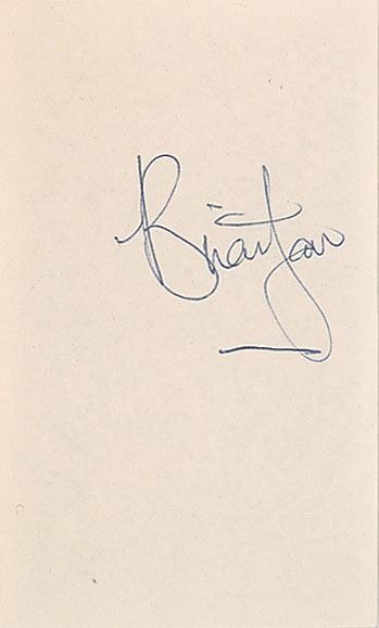 Vintage ballpoint signature of the troubled Rolling Stones guitarist, "Brian Jones,” on an off-white 3 x 5 album page. In fine condition. Accompanied by a small London Records publicity photo, annotated in another hand, "Best Wishes, Rolling Stones."