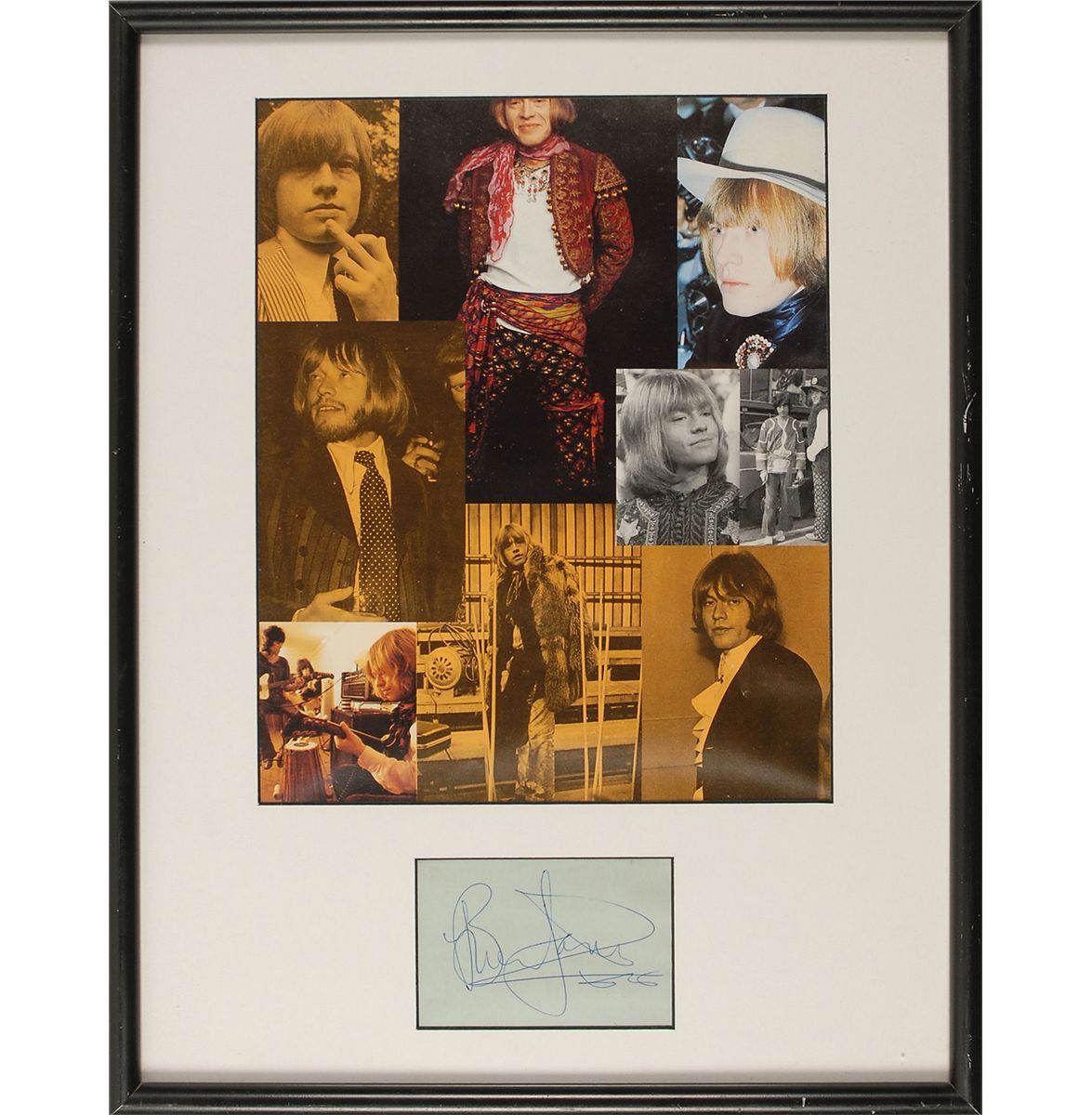 Vintage ballpoint signature, “Brian Jones,” on a light blue album page. Matted and framed with a color composite magazine photo of Jones to an overall size of 14.5 x 18.5. In fine condition.