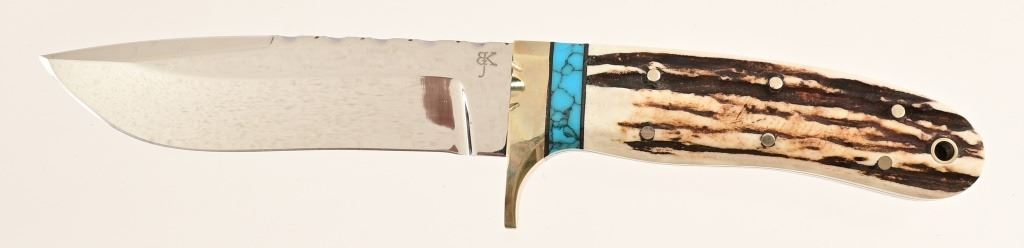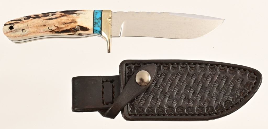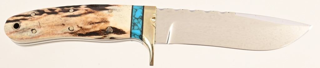 4.875" polished blade, file work to spine & brass guard. Stag-horn grip with inlaid turquoise. Tooled leather sheath. 9.5" overall length