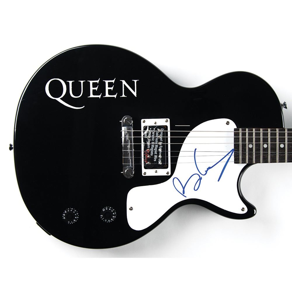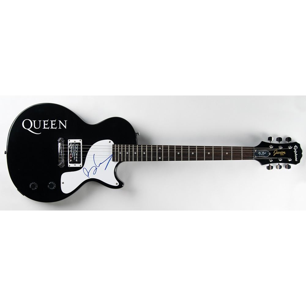 Black-bodied Epiphone Les Paul Junior Model electric guitar with a Queen decal to body, signed on the white pickguard in blue felt tip by Brian May. In fine condition. Accompanied by a full letter of authenticity from JSA.