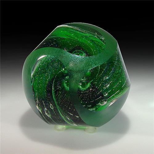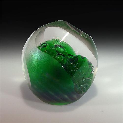 Brian Maytum 1981 faceted frosted abstract design paperweight. Two elongated bubbles stand in the center of a swirling, translucent green folded veil. Frosted exterior, with three, long, slanted side facets. Signed/dated. Diameter 2 13/16". <p>Each winning bidder will receive one copy of "All About Paperweigths" and a paperweight stand for each paperweight won. (One book per winner, one stand per paperweight).