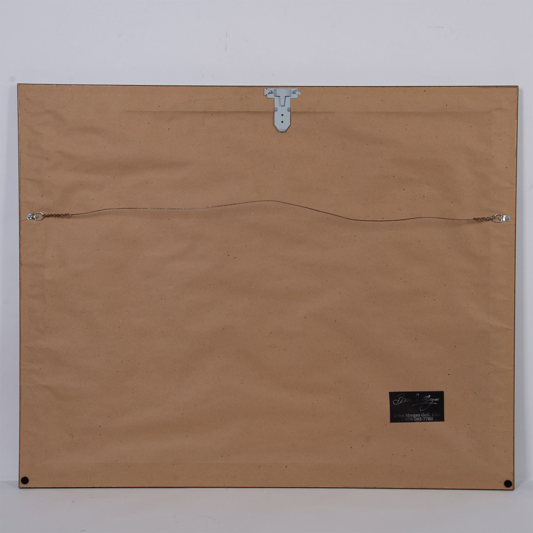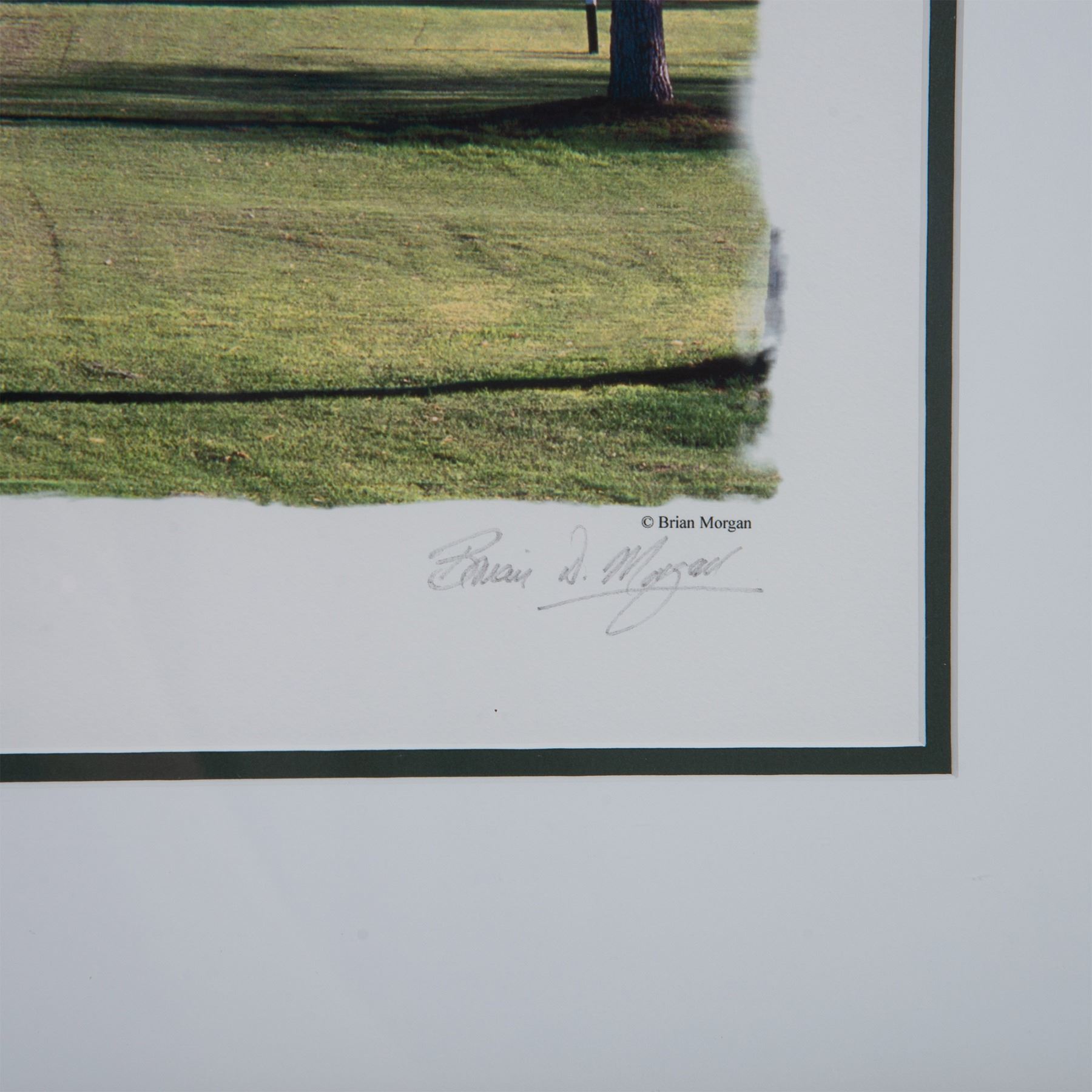 Original color poster size print on laid paper by world renowned Scottish golf photographer Brian Morgan featuring the Paradise Valley Country Club (PVCC) golf course in Arizona. Signature in graphite on lower right side: Brian D. Morgan. On reverse: tag for Brian Morgan Golf, USA. Housed in a wood frame with a white mat. Sight size: 25.50"L x 19"H. Frame dimensions: 36"L x 29.25"H x 1"W. Artwork can be unframed and rolled for shipment.