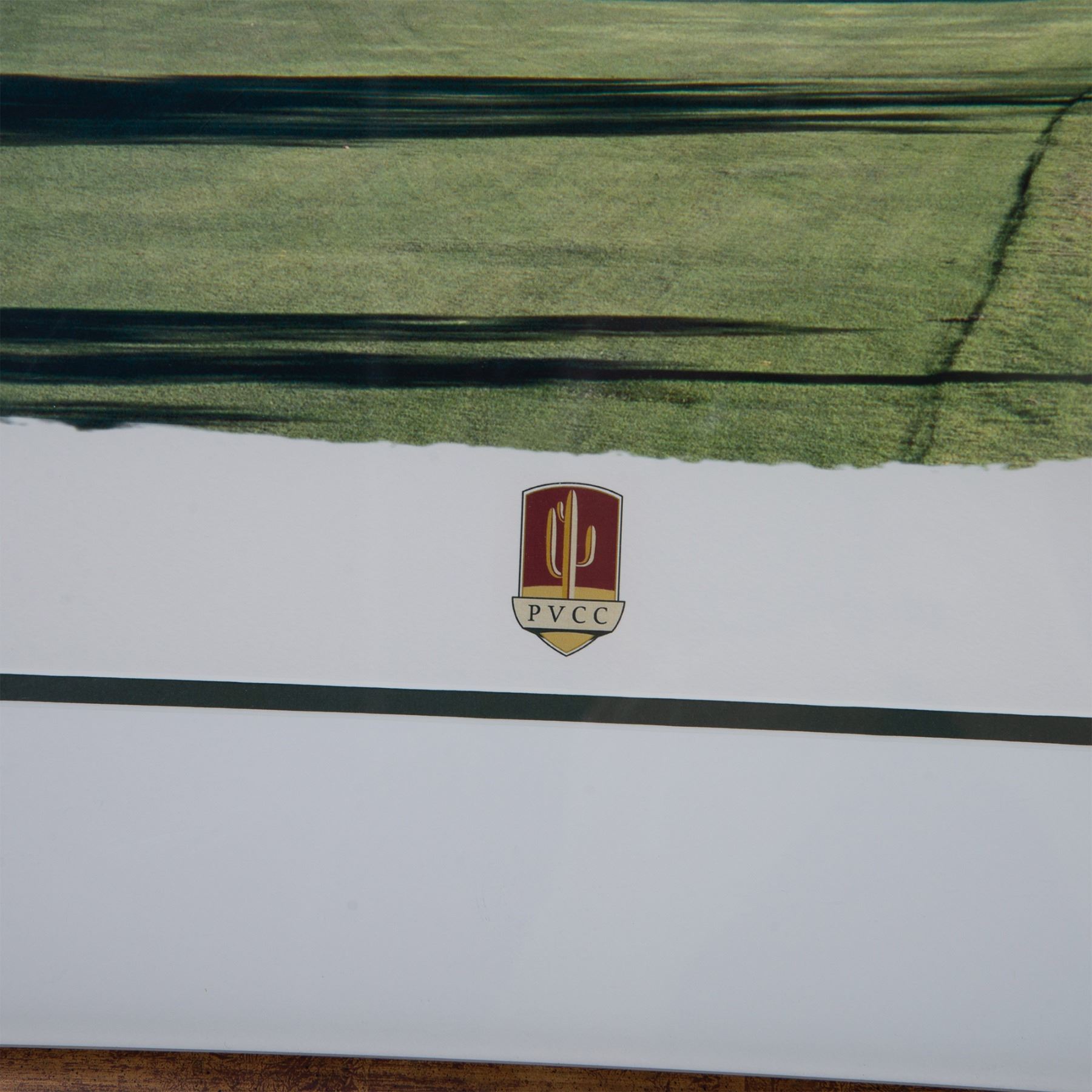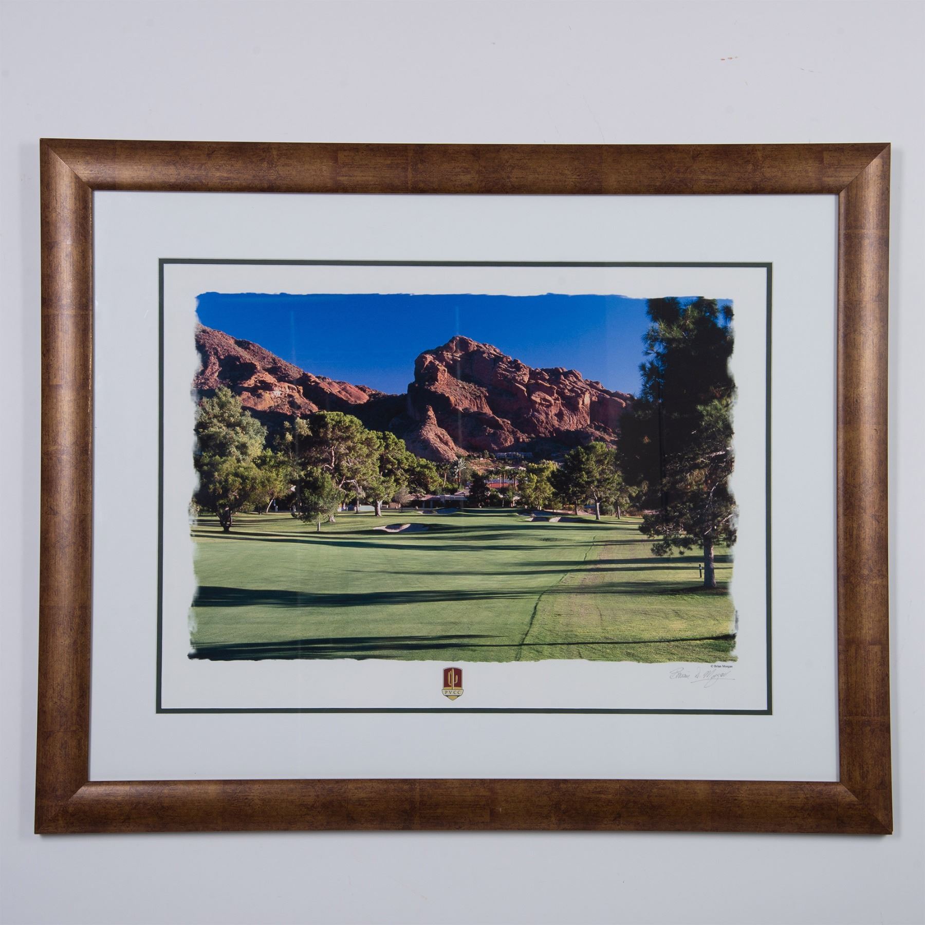 Original color poster size print on laid paper by world renowned Scottish golf photographer Brian Morgan featuring the Paradise Valley Country Club (PVCC) golf course in Arizona. Signature in graphite on lower right side: Brian D. Morgan. On reverse: tag for Brian Morgan Golf, USA. Housed in a wood frame with a white mat. Sight size: 25.50"L x 19"H. Frame dimensions: 36"L x 29.25"H x 1"W. Artwork can be unframed and rolled for shipment.