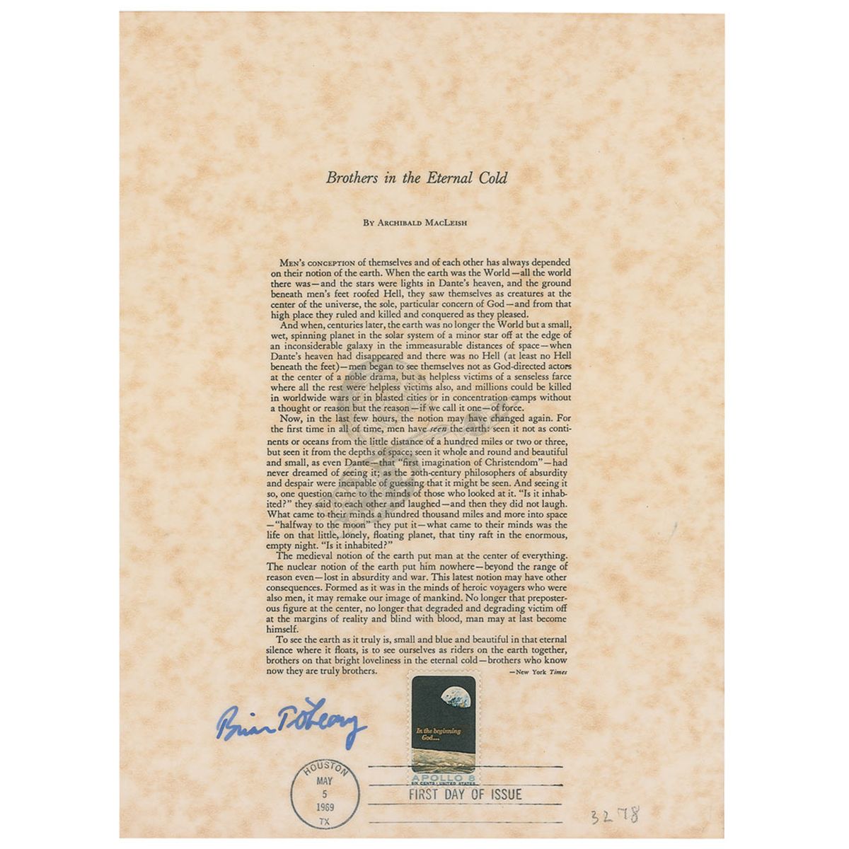 Astronaut (1940–2011) who was a member of the Group 6 class. The members of this group were known as the scientist-astronauts, intended to train for the Apollo Applications Program – a follow-on to the Apollo Program, which was ultimately canceled. Printed commemorative poem entitled Brothers in the Eternal Cold’ by Archibald MacLeish, one page, 8 x 11. Poem, written to commemorate man’s first trip to the moon concludes: “To see the earth as it truly is, small and blue and beautiful in that eternal silence where it floats, is to see ourselves as riders on the earth together, brothers on that bright loveliness in the eternal cold—brothers who know now they are truly brothers.” Signed in the border in blue felt tip by O’Leary. Page also bears a First Day Issue of the Apollo 8 stamp, postmarked Houston, Texas, May 5, 1969. In fine condition, with some light edge toning and a small pencil notation to bottom edge.