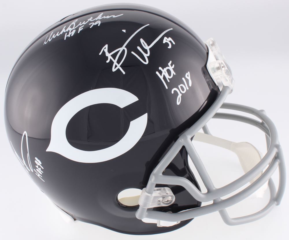 Chicage Bears Throwback Full-size replica helmet. Hand-signed and inscribed in white paint pen by Brian Urlacher (HOF), Dick Butkus (HOF), Mike Singletary (HOF).