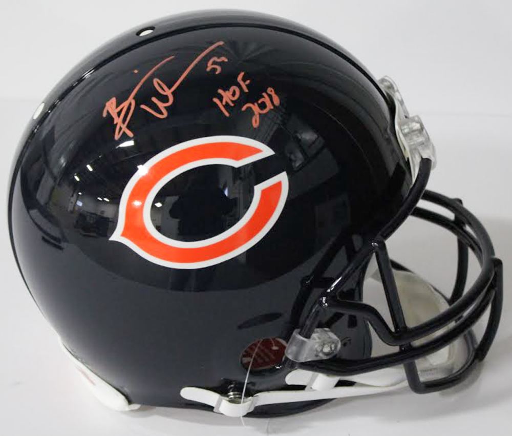 Chicago Bears full-size authentic on-field helmet. Hand-signed in orange paint pen by Brian Urlacher (HOF).